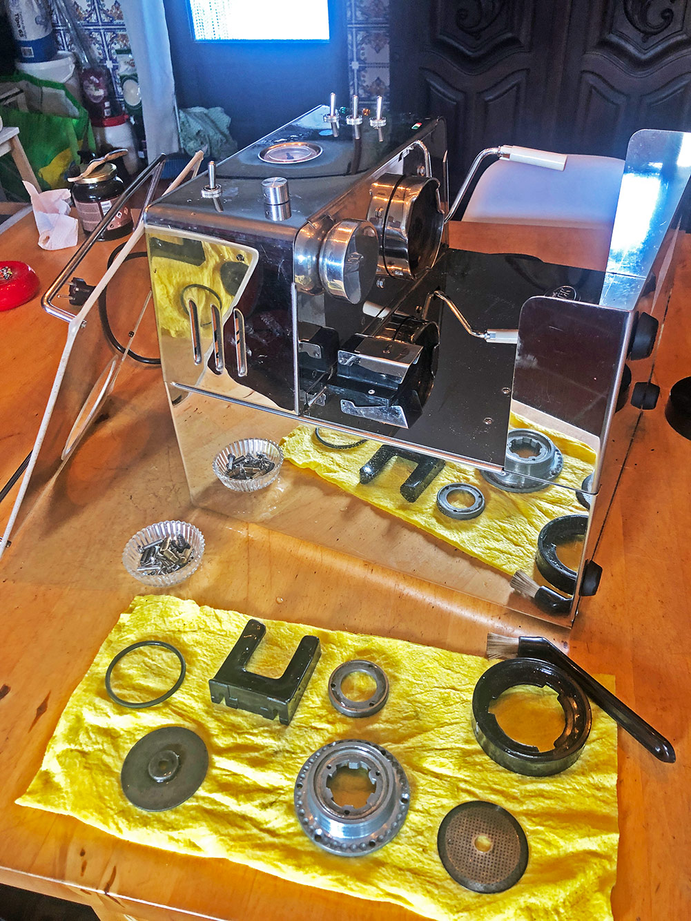 Het is een regenachtige dag. Dan schijnt de zon weer en dan valt er weer een flinke bui. Tijd voor binnenwerk. De espressomachine is al maanden niet schoongemaakt en dat was te zien ook. In het maalgedeelte zit een dikke laag koffieprut van samengeperste bonen. Geen wonder dat het malen wat minder werd. Ook het espressogedeelte krijgt een goede schoonmaakbeurt. Alle prut weg en alle gaatjes van het filter weer open. Weer als nieuw!