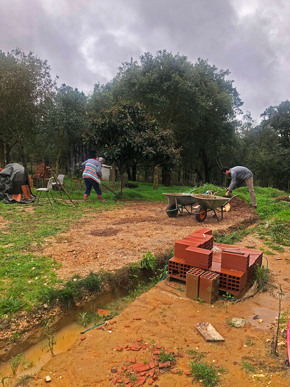 Tussen de buien door, zelfs tijdens de buien, wordt er flink gewerkt aan het wegwerken van de berg voor het huis. De berg is gemaakt door Henri, toen hij de plek ging afgraven waar het terras moet komen. ’t Kan nog wel even duren voordat het zover is, maar elke keer komen we een stapje dichterbij.