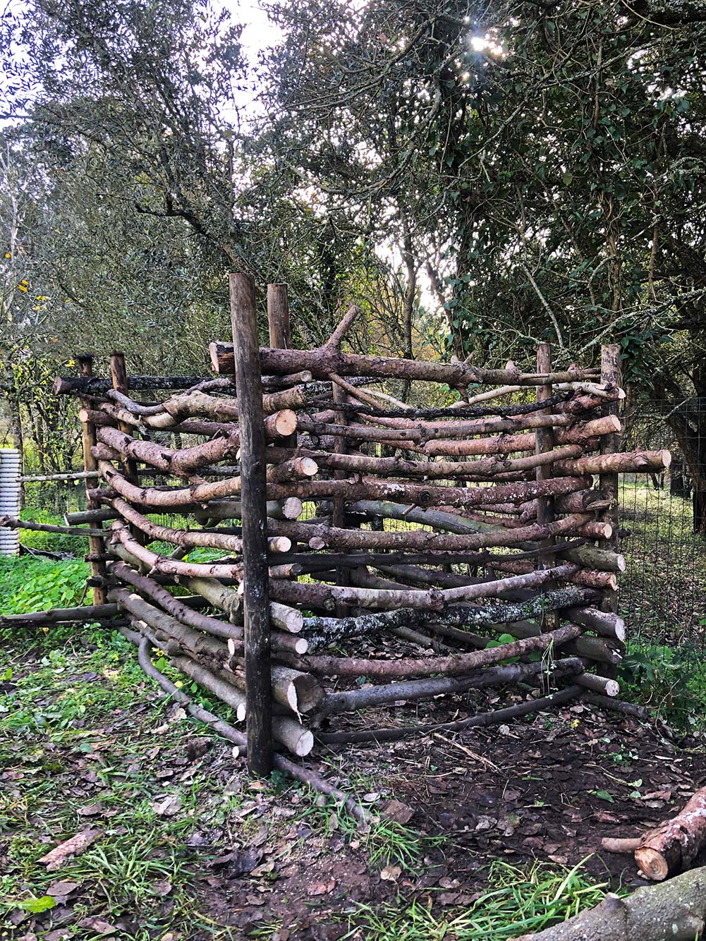We blijven het ontwerp verbeteren. De eerste composthoop was gewoon een berg onder een boom. De tweede versie was gemaakt van aan elkaar geschroefde pallets. Die heeft het toch maar een paar jaar volgehouden. De pallets zijn inmiddels aardig vergaan. De volgende versie was gemaakt van gestapelde plafondstenen. Dat ging ook best goed, alleen in de loop van de tijd stortte dat toch wel in elkaar. Dit is weer een nieuwe versie. Van de takken die we alweer een jaar geleden, nee nog langer, nog voor de Covid uitbrak, afgezaagd hebben, van de pijnbomen, en van de takken van de laurier hebben we een mooi bouwwerk gemaakt. En soort blokhutconstructie. Toegegeven, we hebben het niet zelf bedacht, de inspiratie komt van internet, maar dat maakt niet uit, Het is een mooi ding geworden. Alleen de palen op de hoeken die in de grond staan hebben we aangeschaft. De rest van het hout hadden we nog liggen.