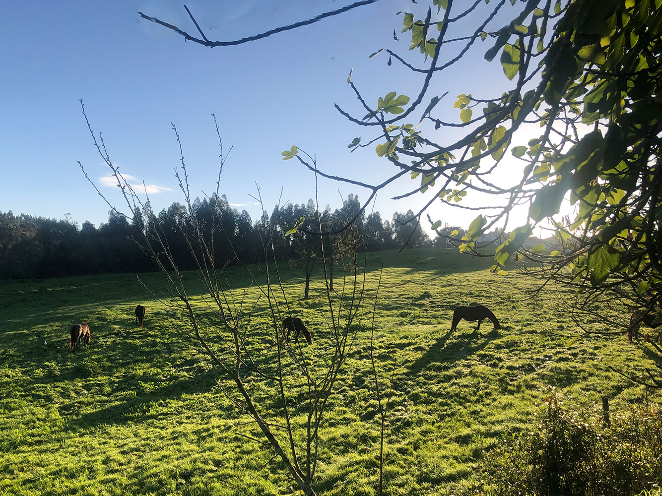 Ook in Portugal worden de dagen steeds korter, niet zo kort als in Nederland, want we zitten nu eenmaal een stuk zuidelijker. Als we met de honden gaan wandelen ’s ochtends, komt de zon net achter de heuvel bij Avelino vandaan piepen en doordat het land hiervoor glooiend afloopt krijg je meteen heel lange schaduwen van de paarden. Die zijn sinds een week weer terug, Dat geeft altijd wat meer dynamiek en reuring. Eén van de merries heeft een bel om, die hoor je lekker de hele dag klingelen. Als je zo ’s ochtends vroeg langs loopt en de paarden ook net wakker zijn is het zo stil dat je ze op het weiland kunt horen grazen. En het mooie is dat de paarden niet bang zijn voor de honden en de honden niet voor de paarden. Milan rent kriskras over het weiland, tussen de paarden door en eromheen. Die trekken zich er niets van aan en grazen gewoon verder.