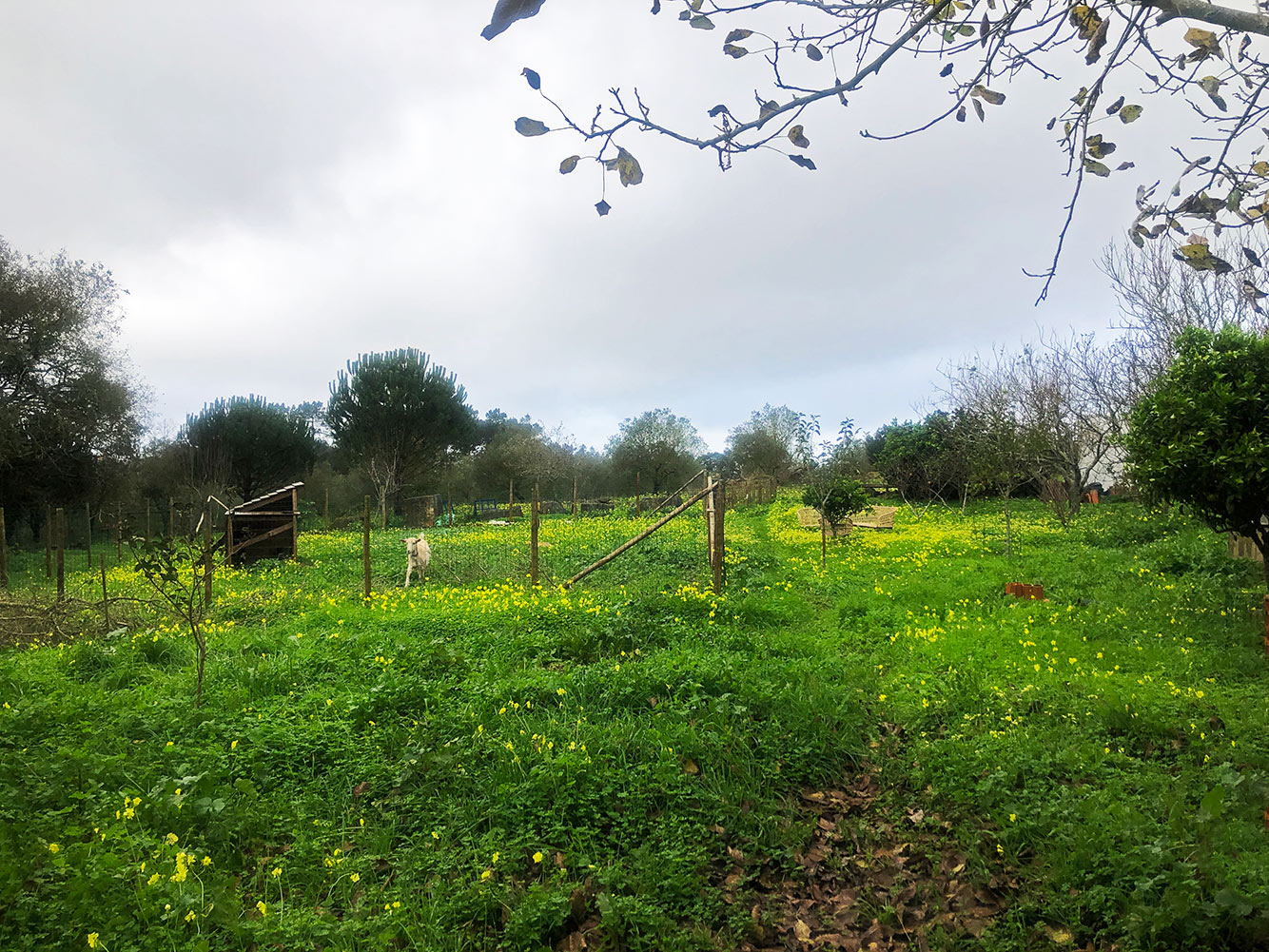 De moestuin is nu grotendeels bedekt met een laag compost van de eigen composthoop. De grond is hierdoor lekker luchtig en daar blijft het water dan ook niet meer staan. Het terrein loopt ook een beetje af, dat helpt wel.