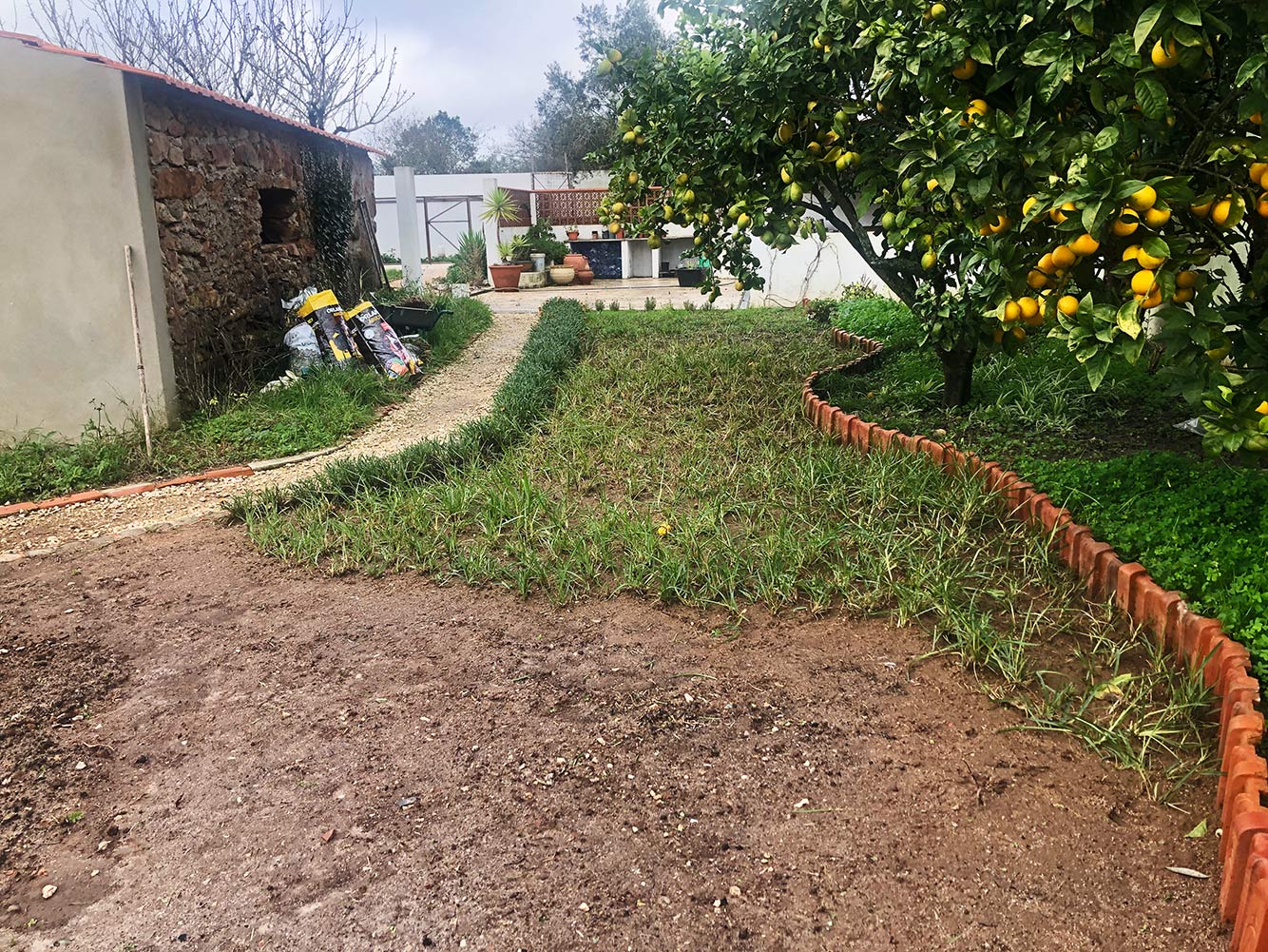 ’t Gaat niet zo snel als dat we verwacht hadden, maar we maken vorderingen. We zijn nu toch wel zo’n beetje op de helft van het grasveldje. ’t Werk wordt nogal bemoeilijkt doordat er veel stenen in de grond zitten. Elke vierkante meter hebben we wel een emmertje met natuursteen, stukken dakpan of ander spul. Wasknijpers komen we veel tegen, maar ook ouderwetse gesmede spijkers. De archeologische dienst zou er een vette kluif aan hebben. De overvloedige regen heeft een voordeel en een nadeel. Als het echt hard gaat werken we niet door aan het grasveld, dus dan moeten we even stoppen, het is wel lekker voor het gras, dat krijgt dan mooi de kans om aan te slaan. Je kunt het ook wel zien, stukken die we dagen geleden aangeplant hebben staan er groen bij. Als het eenmaal aangeslagen is gaat het uitlopen en voor we het weten hebben we een prachtig groen tapijt!