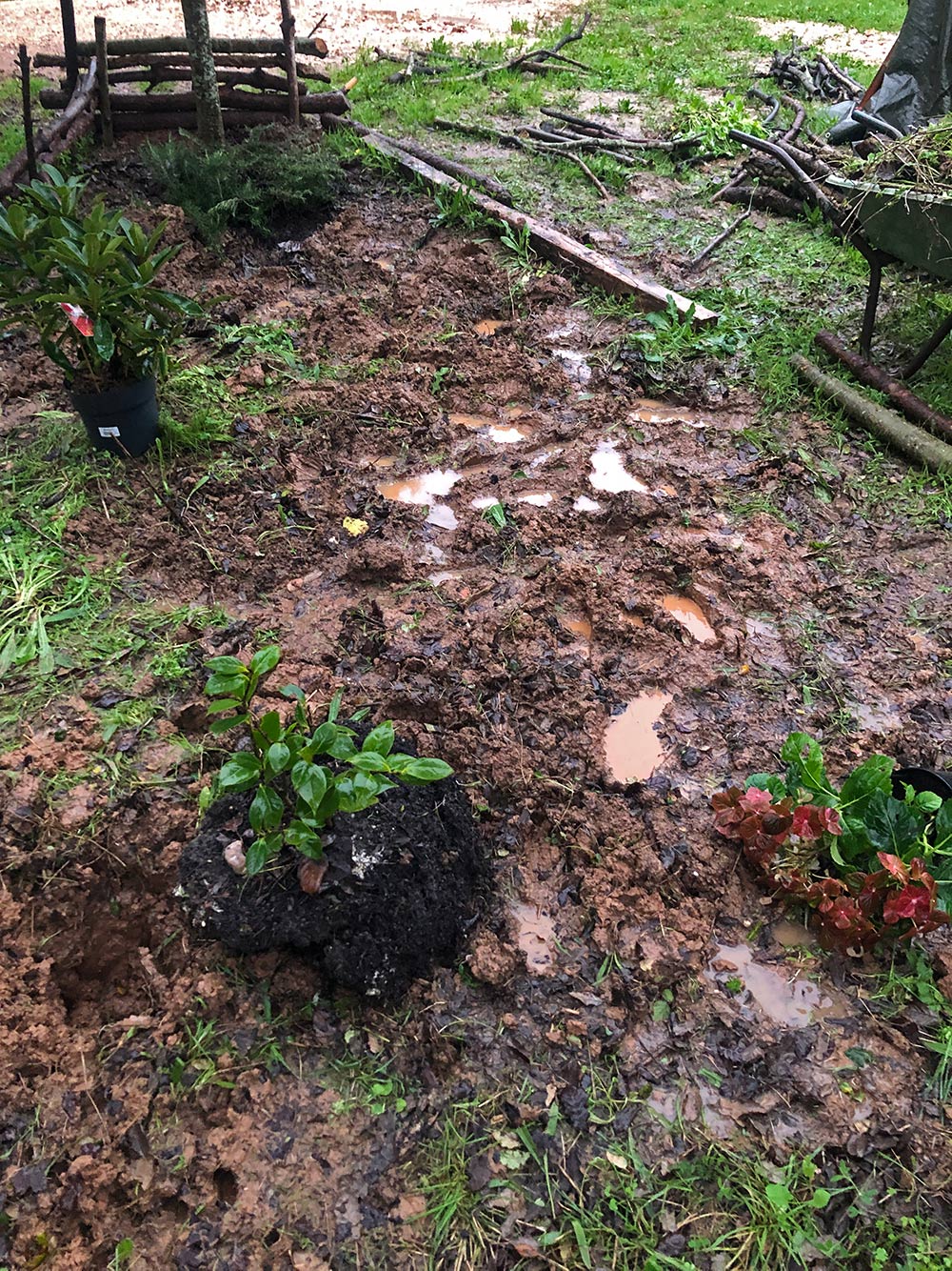 Het is eigenlijk geen weer om buiten te werken, maar tussen de buien door gaat het wel. Vandaag is er meer dan 40 mm gevallen en dat kun je goed zien aan de grond. We zijn begonnen een stukje te ontdoen van bramen, eiken en ander spul. Eigenlijk wel handig nu de grond zo zacht is, sommige bramen trek je zo met wortel en al uit de grond. Wat wel jammer is, is dat de klei erg plakt. Het blijft aan de spade zitten en aan de riek. Als je een beetje heen en weer loopt heb je zo een bonk van vijf kilo aan je laarzen hangen. Wat ook wel link is, is dat de grond niet lekker horizontaal is en je af en toe wegslipt in de modder.