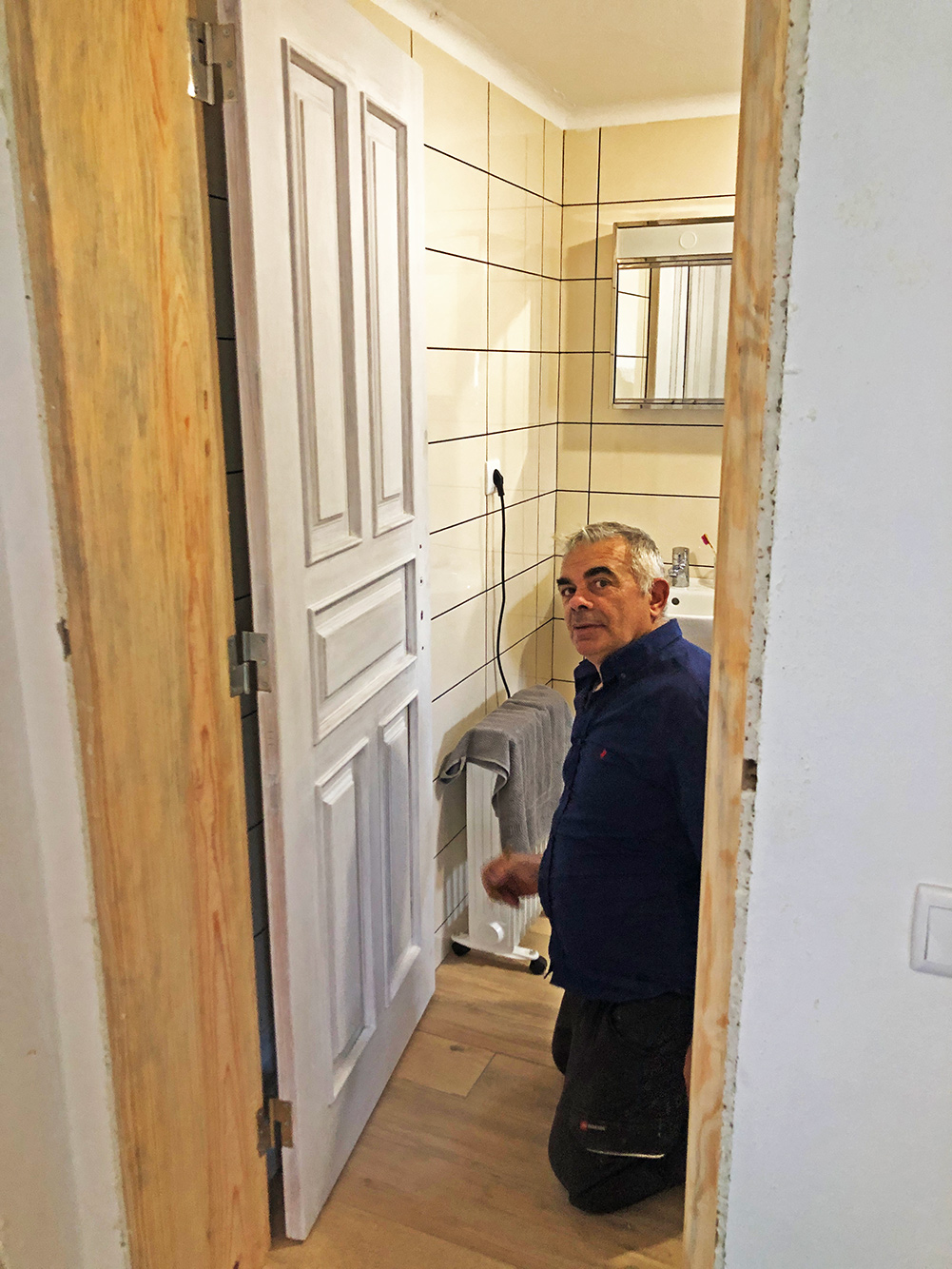 Het is bijna niet te geloven, maar de deuren van het appartement hangen. Vandaag is Armindo geweest om het af te maken. ’s Ochtends eerst de sponningen en ’s middags heeft hij de deuren afgehangen. Op de foto is hij bezig met de eerste deur, maar nu hangen ze allebei. Netjes met de architraven erop. Er moest nog even wat gebroken worden want het paste toch niet helemaal, maar het zit er nu allemaal helemaal in. Inclusief de sloten en de deurklinken.