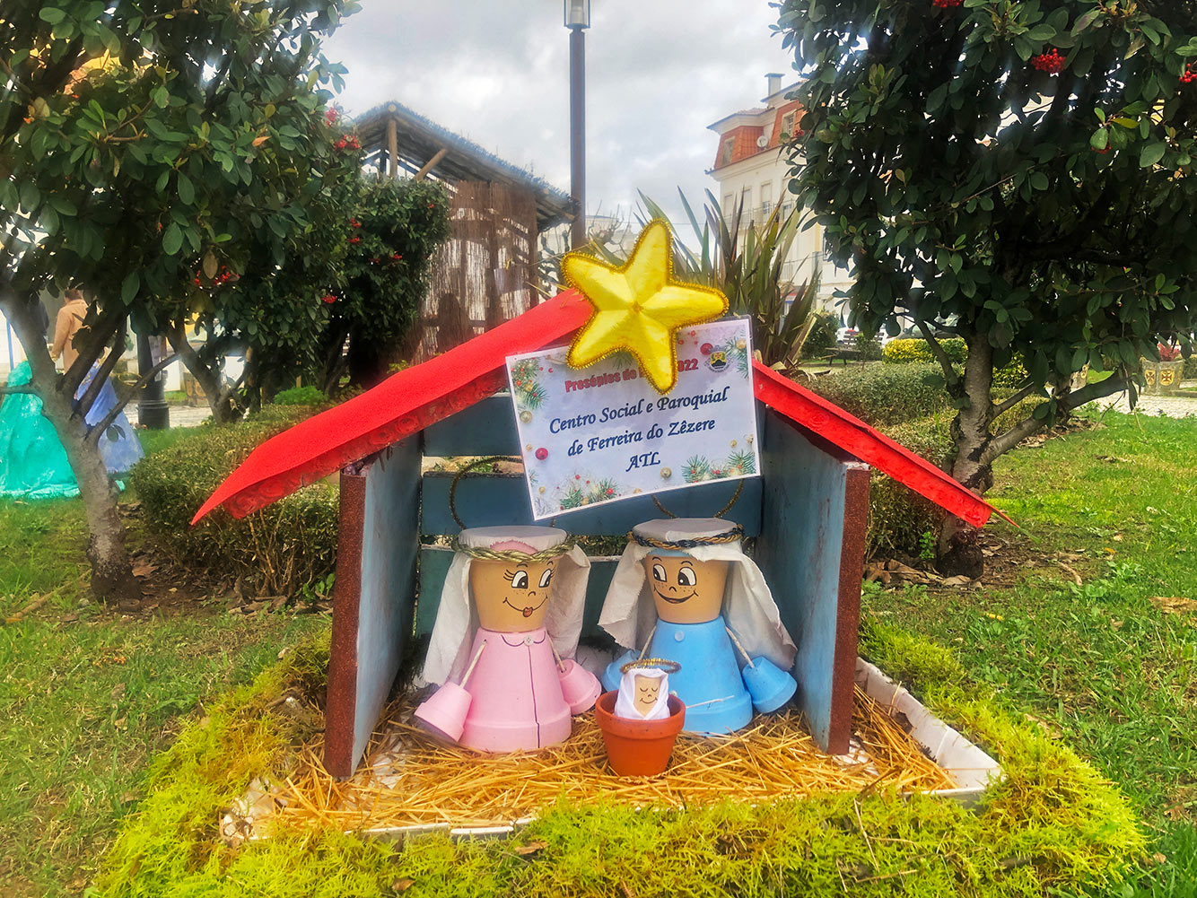Het is een mooie rit, langs Fátima en Tomar, iets verder weg naar het plaatsje Ferreira do Zézere. Dat is zo’n beetje de eerste plek die hij van toen kent. Waar een barretje was, waar de supermarkt was. Het barretje zit op dezelfde plek als hij zich herinnerde, ze hebben er erg goede koffie en lekker pasteis de nata. Op het pleintje van het plaatsje staan allemaal schattige kerststallen, sommige van jute zakken, andere van balletjes met textiel eromheen en deze van bloempotten. Erg schattig.