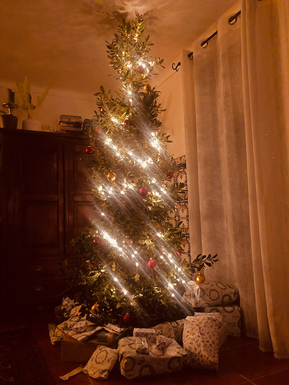 Het is Kerstavond en het is weer gelukt een kerstboom op te zetten. In Portugal zijn kerstbomen niet zo gemeen goed als in Nederland. Je kunt hele kleine krijgen in een pot; en kunstbomen natuurlijk. Je kunt ook een boom via de brandweer kopen. Die kost dan €25, dat geld gaat grotendeels naar de brandweer die in Portugal bijna geheel wordt gedraaid door vrijwilligers. Op zich mooi om op die manier te doneren, maar hét grote nadeel is wel dat je de boom dan in Lissabon moet ophalen, dat is dan ook weer zo’n gedoe.