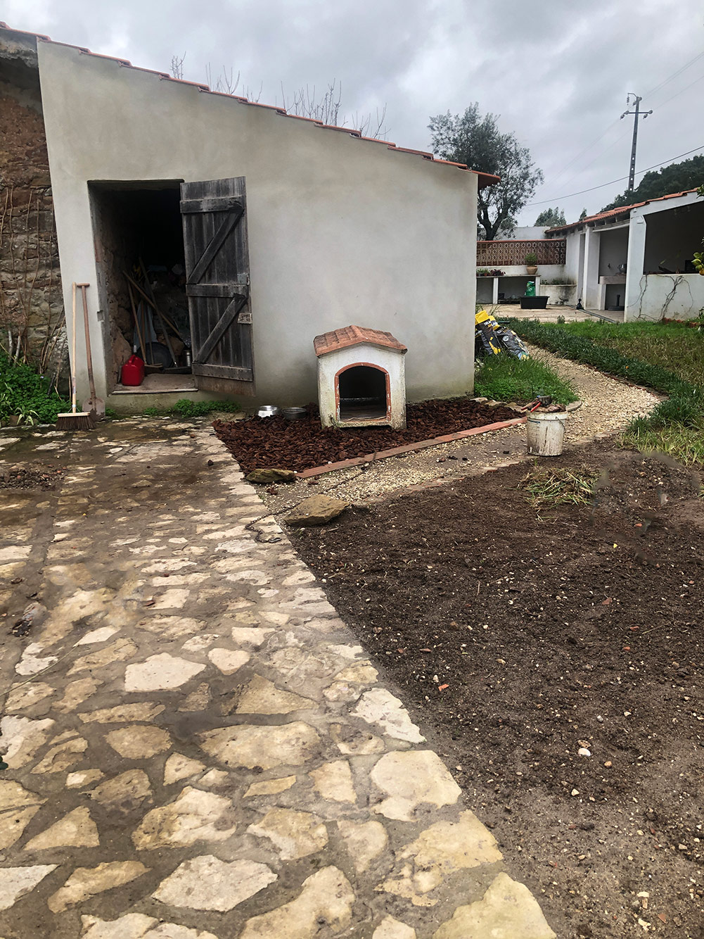 Gelukt! Het ding is verplaatst. ’t Kostte vereende krachten, maar het lukte. Het stuk over het steen ging nog wel, met een hondje eronder verplaatste het tamelijk makkelijk, met zijn tweeën tillen aan één kant. Het stuk over de aarde was een stuk moeilijker, het moest echt getild worden. Gelukkig waren we met zijn vieren en dan één op elke hoek. Optillen en tien/twintig centimeter verder weer neerzetten. En zo langzamerhand op zijn plek. Dan ook nog een stukje omhoog op een paar platte stenen, want anders zakt het ding meteen weg.