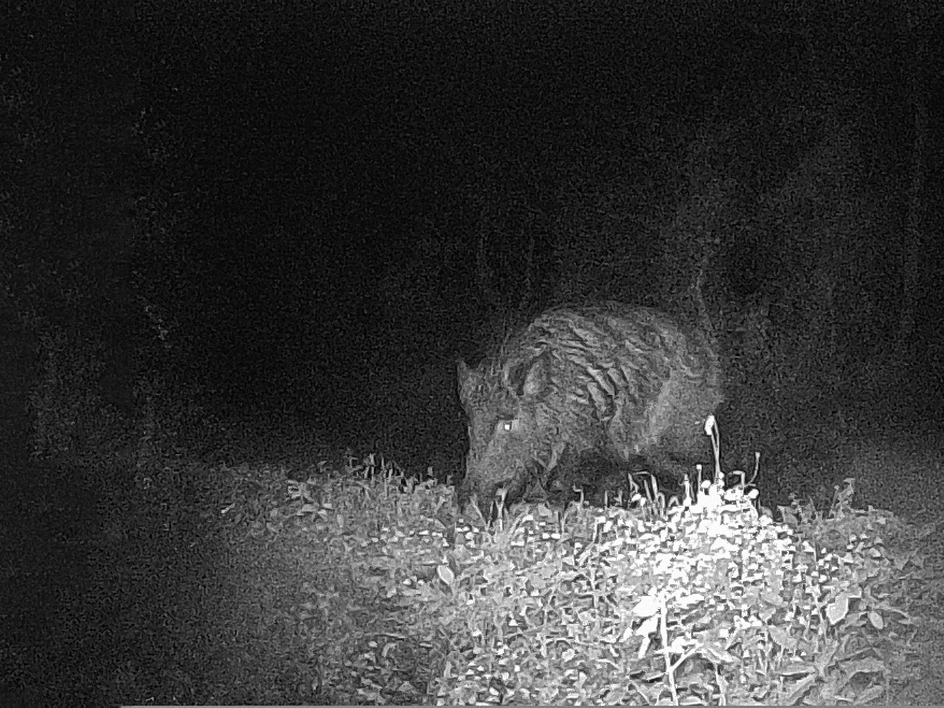 Een paar keer hebben we de wildcam al ergens neergezet. Vooralsnog hadden we alleen Ziva op beeld kunnen krijgen. Nu hebben we de camera niet op eigen grond neergezet, maar ergens langs het weggetje, waar je sporen kunt zien van nachtelijk bezoek. En kijk! Midden in de nacht, om een uur of vier leven op de weg. Een wild zwijn betrapt bij het oversteken. In korte tijd zijn er vier of vijf foto’s gemaakt, dat betekent dat het dier een beetje gescharreld heeft. Waarschijnlijk is het een mannetje dat alleen op pad is. Er zijn geen foto’s genomen van andere dieren er vlak voor of erna. Het was rond een uur of vier in de morgen als het echt helemaal donker is.