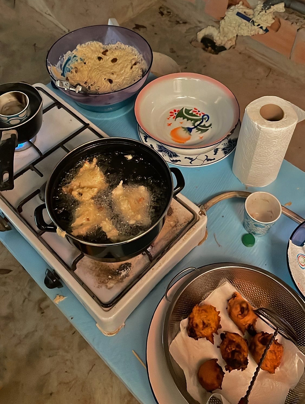 Hier in Portugal zijn we nu lekker met zijn vieren en gaan we het jaar gezellig uitluiden. Lekker traditioneel met allerlei baksels en de oliebollen. Ze worden gebakken op zolder, zodat we de baklucht niet door het hele huis heen krijgen. Het is goed weer, het waait lekker waardoor het in de voorzolder ook goed uit te houden is. We bakken oliebollen dus, bladerdeeghapjes met appel, met spijs enzovoorts. We komen de avond zo goed door!