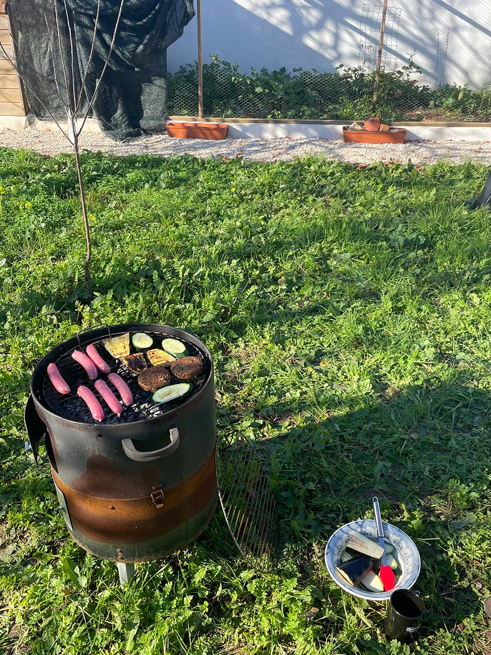 Al het hout waarmee we barbecueën is wel erg nat van de regen van de laatste paar weken en het vuurtje stoken is daarom wel wat lastiger. ’t Hout moet eerst bij het vuur drogen voordat het wil gaan branden. ’t Geeft een hoop gesis en af en toe flinke rookwolken, maar dat maakt de pret er niet minder om. Uiteindelijk toch een laagje kolen voor de eerste ronde en later nog wat kolen erbij uit de zak en we hebben een prachtige lunch op het terras.