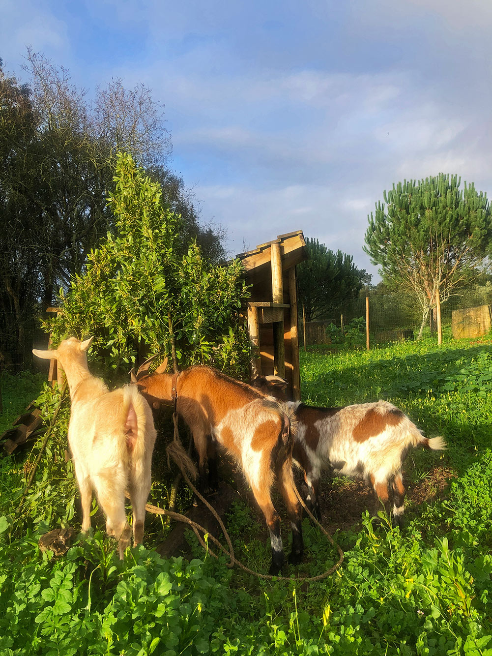 Als de geiten in de kraal gaan krijgen ze altijd een paar flinke takken om te ontbladeren. Er is altijd wel een boom die gesnoeid moet worden en de geiten spelen op deze manier een belangrijke rol in het wegwerpproces. We gooiden eerst altijd de takken gewoon in de wei en de geiten vielen er dan op aan. Maar ze lopen er ook overheen en ze laten zo hier en daar wel eens wat vallen. En als de geiten eroverheen gepiest en gepoept hebben dan willen ze er niet meer van eten. Nu hebben we bedacht de takken rechtop te zetten, zodat ze van een lauriermuur kunnen eten. Ze vallen er ook hier meteen op aan en ze kunnen er niets op laten vallen.