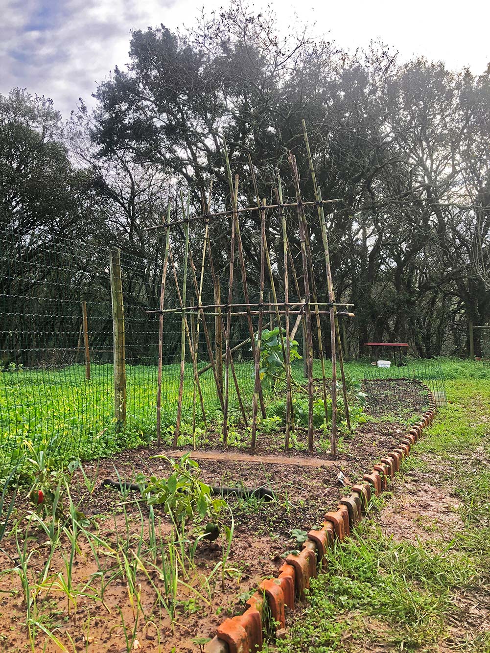 De bonen die Amanda heeft gezaaid staan alweer een centimeter of tien boven de grond. Tijd voor de bonenstaken! Tom en Emily, onze vrijwilligers die gisteren vertrokken zijn, hebben de rietstaken ontdaan van alle bladen. De staken zijn in de grond gezet en verbonden en zo vormen ze een prachtig bouwsel waar de bonen tegenaan kunnen groeien. ’n Beetje gedoe zo’n dingen bouwen als het regent, maar dat maakt de grond wel lekker zacht, waardoor ze er goed ingeprikt kunnen worden.