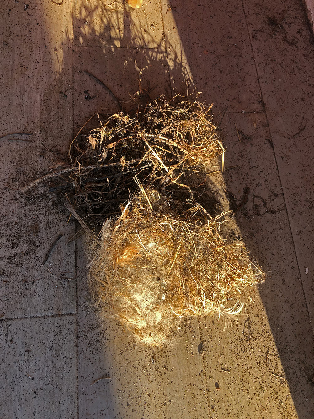 Wat er nou is gebeurd? Ineens ligt het vogelnestje op de grond van de schuur. Het zit er al een paar jaar en er zijn al zeker twee nestjes geweest en zo’n beetje tien kleine vogeltjes uitgevlogen. Maar nu ligt het dus op de grond. Het kan niet door de katten komen, want het zat op een plek waar ze echt niet bij kunnen. Misschien is er een constructiefoutje ingeslopen, werd het nestje topzwaar en bezweek het onder het gewicht van de laatste uitbouw.