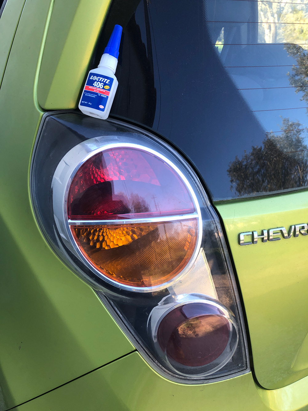Een maand geleden ongeveer viel na een lichte aanraking, plotseling de kap die over de achterlampen van de auto zit op de grond. Het ding kan niet vastgeklikt worden, wat je zou denken. Het was kennelijk gelijmd. Met een prittstift gaat dat natuurlijk niet en velpon zal ook niet goed genoeg zijn. Pieter wees op een sterke lijm, loctite 406. Het is een soort tiensecondenlijm, die nogal sterk schijnt te zijn. Op internet blijk je dat te kunnen bestellen via een Portugese site, althans dat leek zo. Het is toch een international opererend bedrijf en de spullen komen uit China. Tsja.