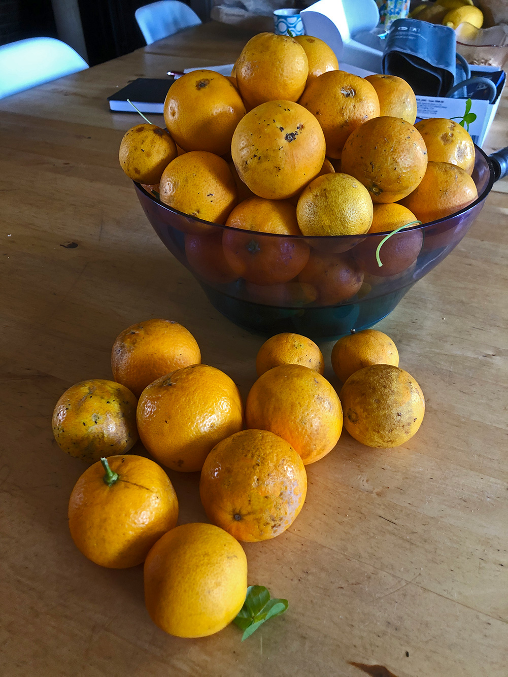 Het is ineens weer flink gaan waaien in Portugal. De sinaasappelboom heeft van schrik heel wat sinaasappels laten vallen. Ruim een hele schaal! Eigenlijk plukken we bijna niet, we rapen alleen, tenminste van deze boom. Het is wel mooi dat we meerdere bomen hebben die sinaasappels geven, van deze is het goed sap persen. De andere zijn groter en een stuk zoeter die dan weer goed uit de hand.