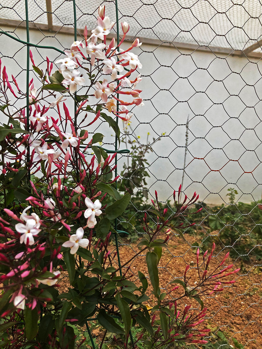 Op de verjaardag van (schoon-)zus staat de Jasmijn in bloei. Bij het kippenhok hebben we een bloembak gezet met daarin de plant. Eigenlijk staat hij niet in de bloembak, want daarvan hebben we de bodem er uitgehaald, hij staat in de volle grond. De bloembak is bedoeld om het grind van het pad een beetje weg te houden. Het duurde lang voordat hij aansloeg, maar nu lijkt het toch wel dat de weg gevonden is. Hij kruipt langs het gaas omhoog en ondertussen staat hij lekker te bloeien. De kippen aan de andere kant van het gaas hebben er zo ook een beetje lol van. Al lijken ze meer geïnteresseerd in de torretjes en wormpjes die in de bak zelf zitten. Goed dat ze er niet bij kunnen.