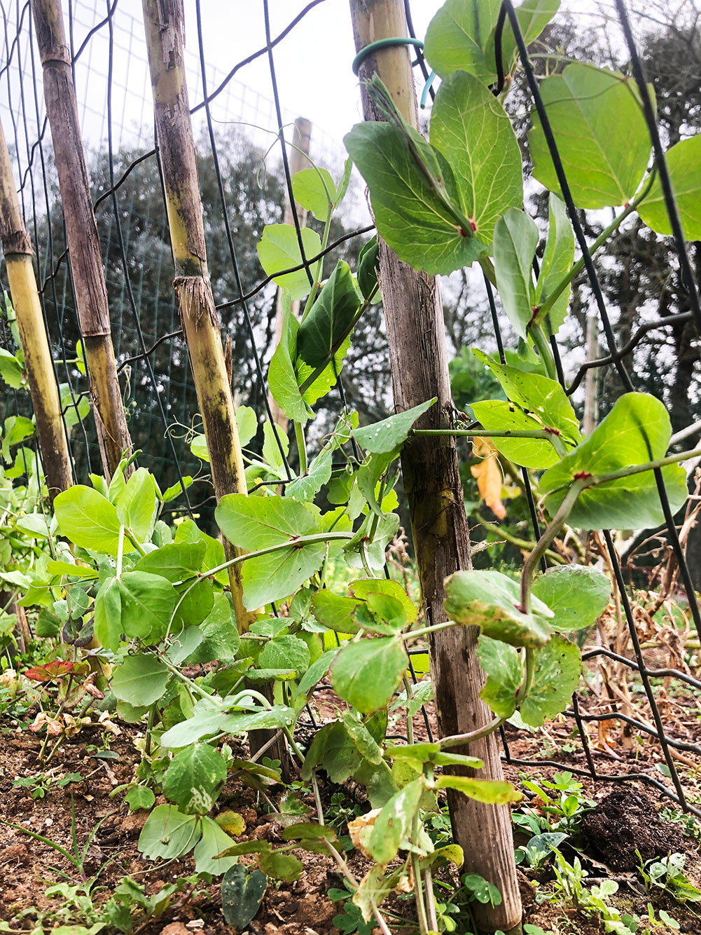 Sommige planten zijn eigenwijs. Bouw je een mooi klimrek voor ze, gaan ze gewoon plat over de grond een beetje in de rondte groeien. Dan maar wat drastischere maatregelen. Aan de bamboestaken dan maar een stuk gaas gemaakt. Hadden we nog over van één van de hekken die we weggehaald hebben. Op dat gaat de planten voorzichtig gevlochten en nu maar hopen dat ze verder zelf de weg naar boven kunnen vinden.