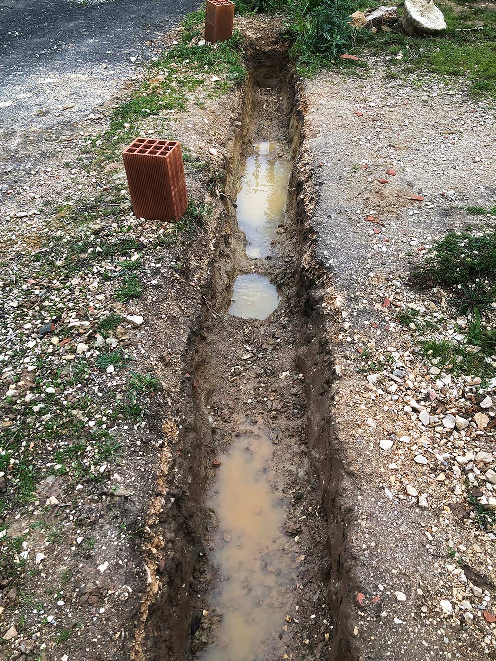 De regen is goed te keer gegaan afgelopen nacht. In de greppel voor het nieuwe hek staat nu water en de gaten waar de pilaren moeten komen staan helemaal vol. Ze zijn zelfs niet meer te zien. Er is dus niets gebeurd vandaag, tenminste niet aan het hek. Overdag heeft het niet geregend, het was zelfs lekker weer Rui liet weten dat door de regen zijn schema een dag achter loopt en dat hij daarom maandag komt. Hopelijk gaat het tussendoor niet meer regenen dan heeft de greppel de tijd om in te drogen en met een beetje mazzel kan er dan maandag eindelijk begonnen worden.