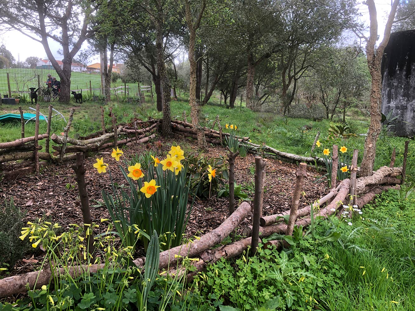 Het is dan wel niet de Keukenhof, daarvoor hebben we iets te weinig narcissen, maar het ziet er wel gezellig uit, die bloeiende planten in de driehoek. De boomstammetjes als afrastering werkt goed, Tomás en Milan weten dat ze er niet in mogen komen en daar houden ze zich goed aan, hierdoor doen de planten het in de driehoek erg goed. Er is met de foto wel gesjoemeld, de stapels dakpannen die er nog staan zijn eruit gephotoshopt, anders zie je alleen maar die dakpannen. De mannen in de achtergrond zijn er echt, dat waren Jehova´s getuigen of leden van een ander genootschap. Ze werden hartelijk begroet door Tomás en Milan, ze kwamen even hun boodschap brengen, maar ze drongen niet echt aan. Ze gingen vriendelijk groetend, maar onverrichterzake terug het weggetje op.