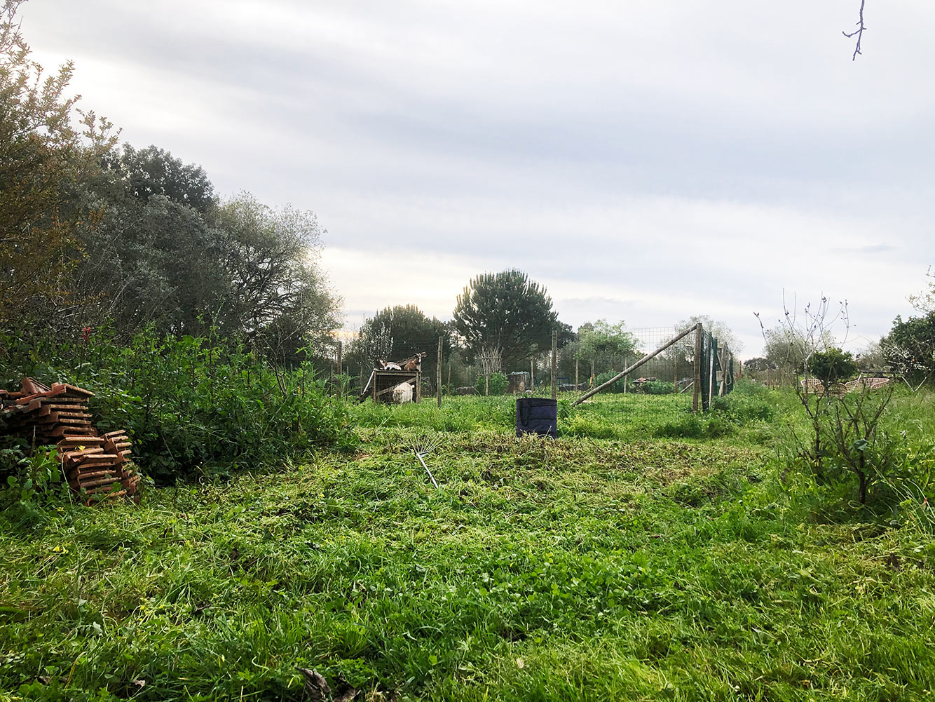 Eerst de geiten even laten banjeren, wel aan een touw hoor, anders zitten ze zo in de fruitbomen, en dan met de bosmaaier er nog even overheen. Ziet het er meteen een stuk beter uit. Meteen na het maaien is het nog even rommelig, maar na een paar dagen als het gras zich weer op richt en de dode planten alweer zo’n beetje verdwenen zijn, wordt het allemaal veel vriendelijker. En begaanbaar.