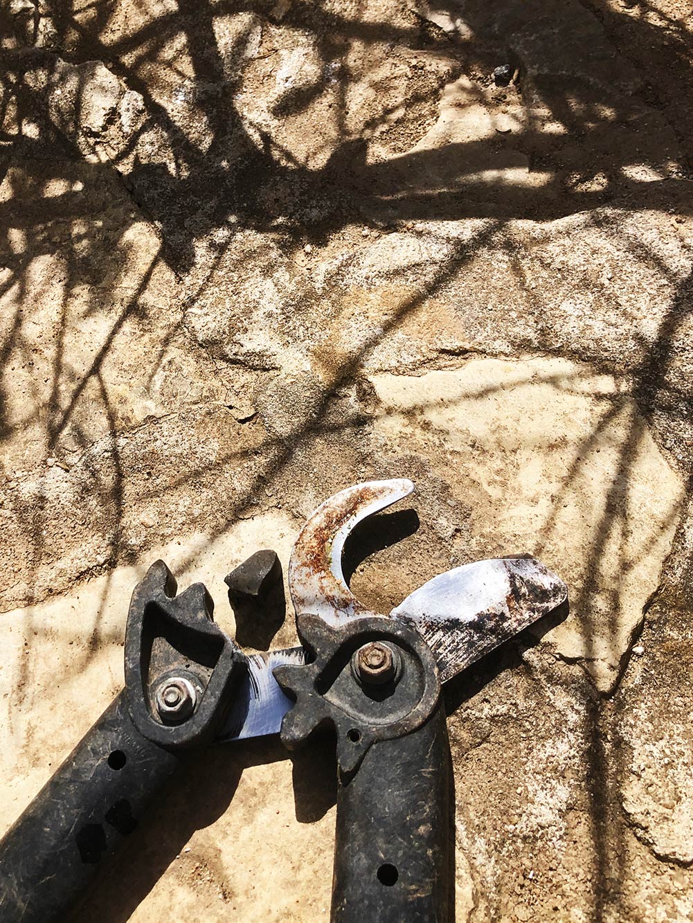 Dat heb je met dat zware werk. De takkenschaar is gebroken. Waarschijnlijk te vaak gebruikt met net iets te dikke takken. Nou ja, het ding gaat alweer vijf jaar mee en het begon ook al een beetje bot te worden. ’t Gebeurde al te vaak dat de tak klem kwam te zitten tussen de tanden van de schaar in plaats van dat de tak doorgeknipt werd. Dus weer tijd voor een nieuwe.