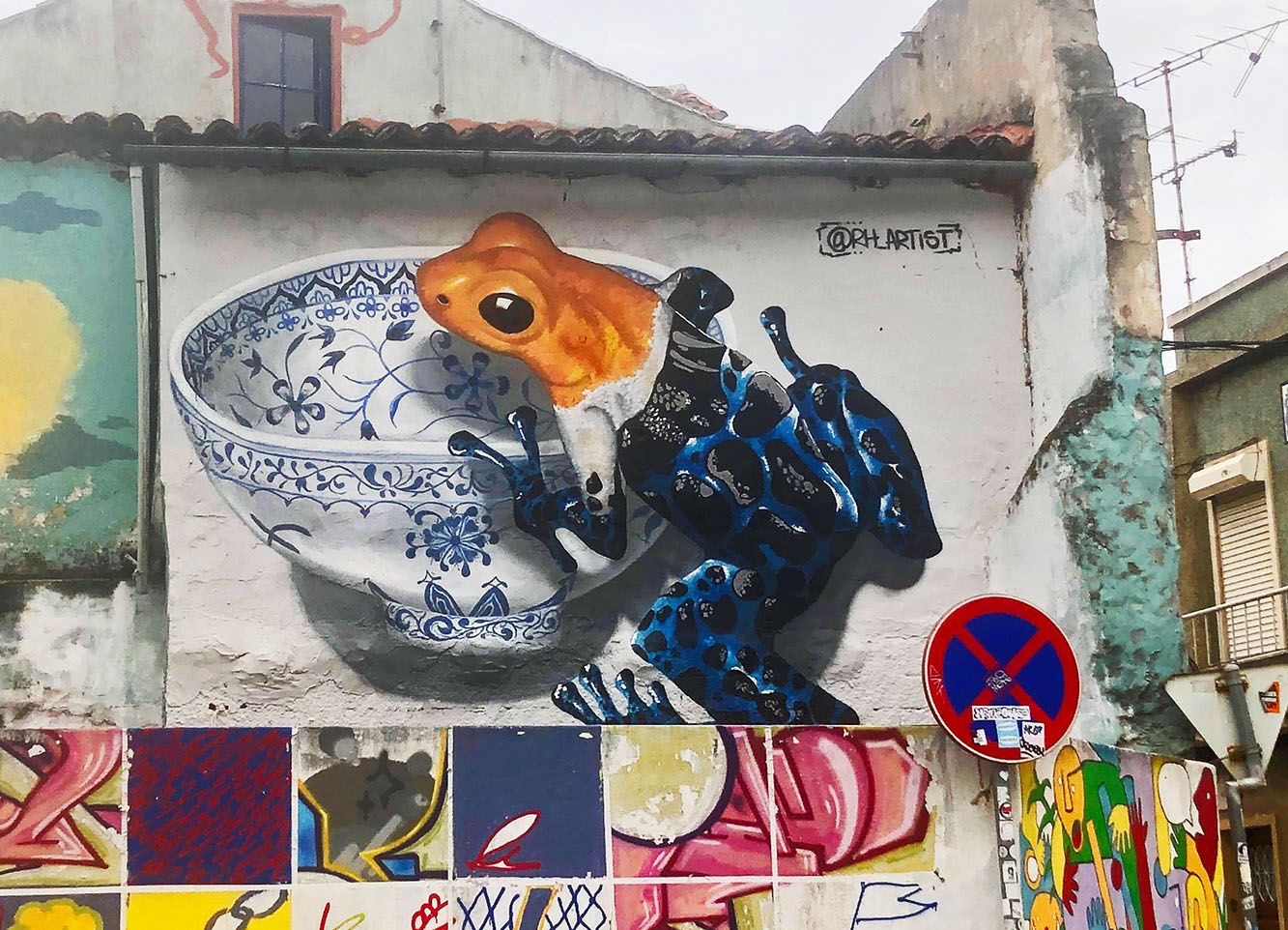 Eén van de dingen waarom Caldas da Rainha beroemd is, zijn de keramieken werkstukken van Bordallo Pinheiro. In Caldas vind je levensgrote werken van hem en er is een keramiekmuseum waar veel van zijn werk te zien is. In Caldas vind je ook veel muurschilderingen en in dat geval lijkt het werk geïnspireerd door het keramiek werk. Dit kunstwerk staat op de achtermuur van een afgebroken huis. Het huis zelf is weg, er staat een schutting om het terrein. Eén van de artiesten, er staat iets van een ondertekening rechtsboven, heeft kennelijk gekeken naar de keramiekkunst en daar zijn werk op gebaseerd.