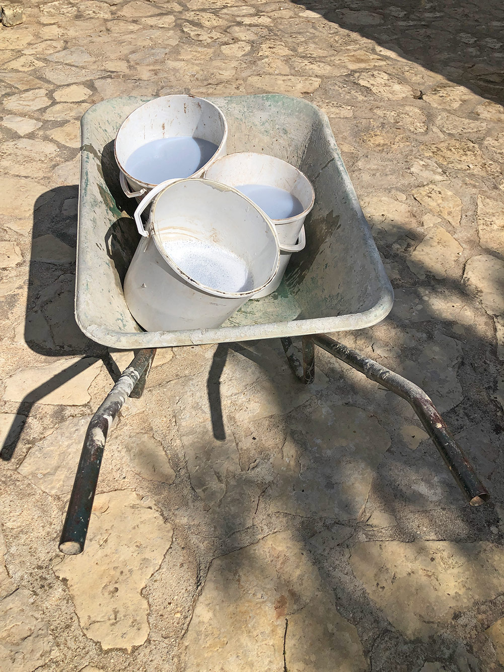 De bakken die we hebben gekocht om water op te vangen zijn niet nieuw. Het zijn gebruikte bakken en je weet daarom nooit wat erin gezeten heeft. De verkoper verzekert dat het geen chemische stoffen zijn geweest. Niet echt schadelijk voor de gezondheid. In één van de bakken heeft waarschijnlijk iets van houtlijm ingezeten, het was gedeeltelijk nog vloeibaar. Veel spoelen dus. Nu bleek een gedeelte van de lijm al uitgehard te zijn. Op de bodem zat een dik plakkaat en op de zijwanden een doorzichtige film. Ga dat er maar eens uithalen. De bakken hebben aan de bovenkant een gat van zo’n zestien centimeter. Je kunt er dus niet in. Een schoffel wel, daarmee kun je dan een beetje over de bodem schrapen en zo de lijm massa loskrijgen. Met zo’n grijpertje, waarmee je dingen kunt oprapen zonder te bukken, kun je dan de lijmstukken eruit vissen. Dan uiteindelijk lekker spoelen. Er komt vies water vanaf, dat we nou niet echt aan de planten in de moestuin willen geven. Dan maar de bosjes in, waar niks groeit dat eetbaar is.