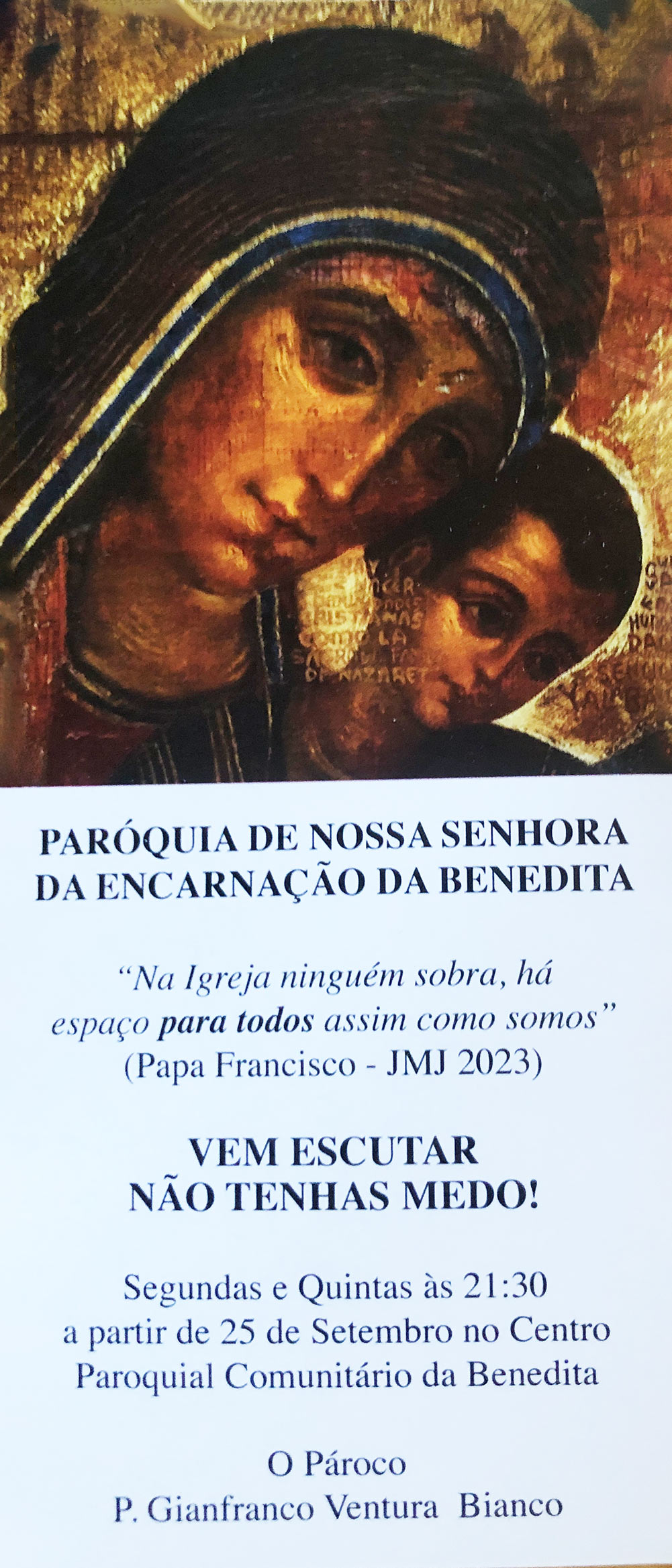 Het gaat kennelijk niet zo goed met het katholieke geloof in Portugal, van oudsher toch een katholiek bolwerk. Na de Moorse overheersing dan. Bij de supermarkt staan twee mensen, die je aanspreken en vragen waar we vandaan komen. Ah, uit Nederland, maar jullie wonen hier? Jazeker, in Casal da Marinha. Kleine tegenvaller, want Casal da Marinha ligt in de gemeente Caldas da Rainha en Benedita, waar we naar de supermarkt gaan in de gemeente Alcobaça. Maar de mannen laten zich niet van hun stuk brengen. Komen we wel vaak in Benedita? Jazeker daar doen we de boodschappen. O, gelukkig dan zijn we uitgenodigd om naar het parochiecentrum te komen om te luisteren. Naar wat is niet helemaal duidelijk, ook het kaartje dat we meekrijgen is wat dat betreft niet helemaal helder. Het zegt Vem escutar. Não tenhas medo. Kom luisteren, wees niet bang.