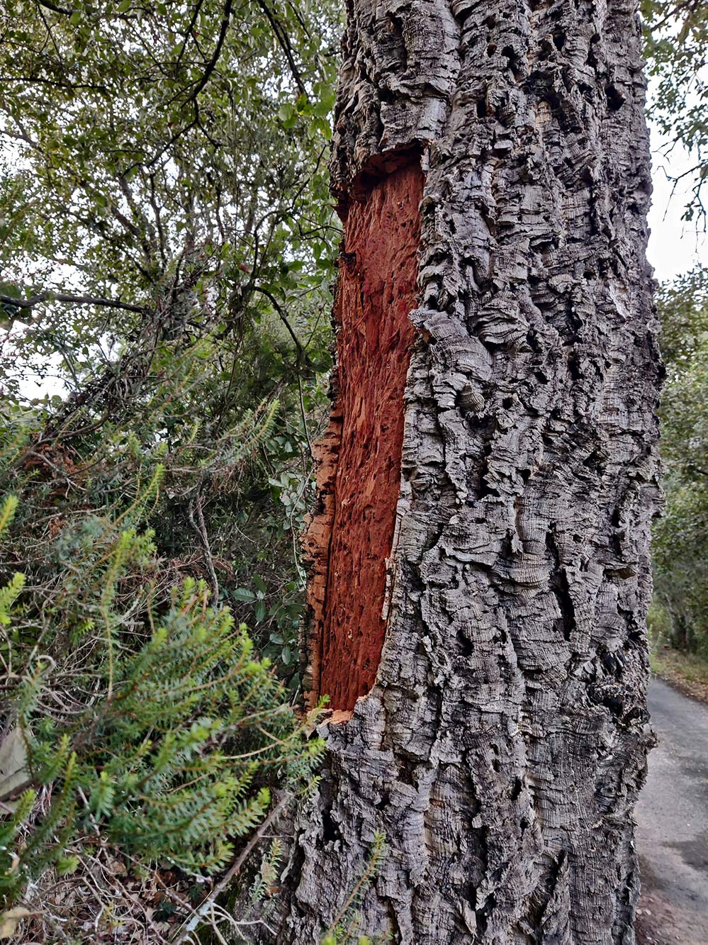 Wat is hier nu weer aan de hand. In de berm van het weggetje staat een kurkeik. De berm is een stuk hoger dan de weg, de stam begint daarom zo’n meter boven het wegdek. Van de weg af kun jet bijna niet zien maar er is een heel stuk kurk weggehaald. Normaal gesproken wordt de bast eens in de zeven jaar geoogst en de opbrengst gaat dan naar de eigenaar van het land waar de boom staat. De onderkant van de stam, pakweg de onderste twee meter wordt dan ontdaan van de bast. De boom vindt dat niet erg, als het er niet vanaf gehaald wordt laat de boom het zelf vallen.