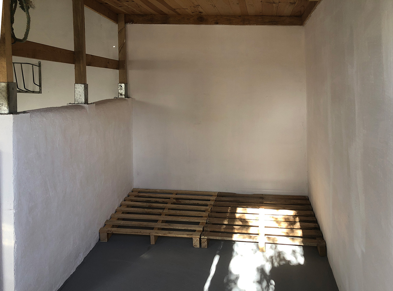 De stal hebben we lekker opgeknapt. Tijd om het stro en het hooi te plaatsen. Er liggen al twee weken twee strobalen in het busje en in het Oude Huis ligt een hooibaal. Een andere hooibaal ligt los in een grote puinzak met een stuk plastic eroverheen. Dat kan nu weer naar binnen. Het hooi en stro willen we niet op de vloer hebben, je weet nooit of er vocht is en of het gaat schimmelen. Daarom vlonders gemaakt. Natuurlijk is alles lekker scheef dus er moest maatwerk aan te pas komen. Eén pallet hadden we nog en die heeft toevallig precies dezelfde lengte als een strobaal. Een andere palet die we ergens vandaan gehaald hebben was te lang en te breed, dus die hebben we lekker uit elkaar gehaald en precies pas gemaakt. Voor en achter scheelt bijna twintig centimeter, maar daar zie je op deze manier niets meer van. Er passen precies vier hooi/strobalen naast elkaar en er kunnen er ook nog eens vier bovenop.