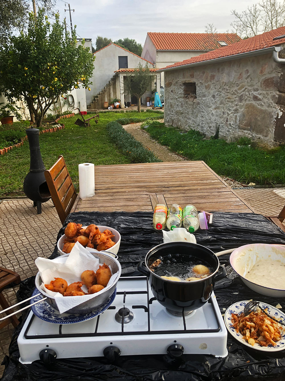 Traditie natuurlijk, en misschien wel daarom wel zo leuk. Oliebollen bakken op Oudejaarsdag. Vanwege de baklucht die het genereert doen we het lekker buiten. Niet dat de baklucht zo vervelend is, eigenlijk wel zo lekker, maar als je het een paar dagen later ruikt als je binnenkomt is het een stuk minder. Vandaar buiten op het terras. Zonder zon, dat is dan wel jammer, maar ook zonder regen en dat is dan juist weer prachtig. Een middagje bakken en we hebben twee schalen vol.