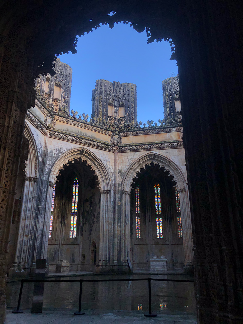 In Batalha staat een klooster. Het is er ooit neergezet uit dank aan Maria, omdat zij in 1385 geholpen zou hebben bij de strijd van de Portugezen tegen de Castillianen. Koning João had een eed afgelegd dat als hij zou winnen hij een klooster zou bouwen. Zo gezegd zo gedaan. Het is een immens klooster geworden. Er is tweehonderd jaar aan gewerkt en het is eigenlijk niet af. De kapel is de Onvoltooide Kapel. Er is geen dak nog en de pilaren lijken ook nog een stuk hoger te moeten, het is niet als het bouwwerk van Gaudi waar nog steeds aan gewerkt wordt. De bouw ligt hier al eeuwen stil.
