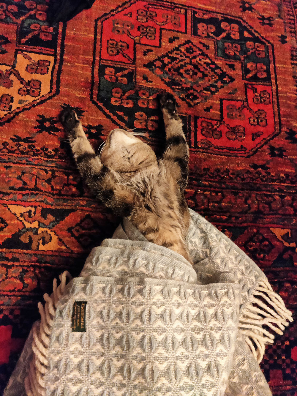 Het regent weer behoorlijk in Portugal. Gisteravond ook nog met harde wind. Je zou bijna zeggen dat het herfst is. Buiten koud en nat, binnen daarom des te behaaglijker. ’t Elektrische matje doet het geweldig. Je krijgt er lekkere warme voeten van. De katten kunnen er ook van genieten. Als je denkt dat je het matje vergeten bent uit te zetten, hoef je alleen maar naar de katten te kijken. Die liggen dan lekker te soezen op de grond, wat ze anders eigenlijk liever niet doen. Liever wat hoger op een kussentje. Maar als het matje aanstaat veranderen ze schielijk de voorkeur. Ziva spant de kroon die ligt lekker uitgeteld en uitgestrekt van het leven te genieten.