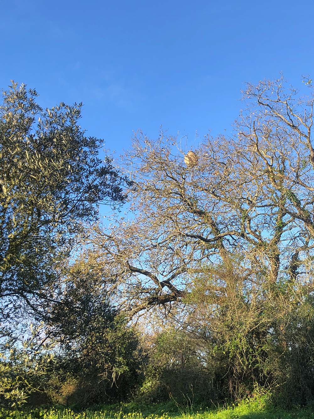 In de nazomer hebben we een val gemaakt tegen de Aziatische Hoornaar. We hebben drie exemplaren weten te vangen, maar of dat een beetje effectief is geweest is maar de vraag. In ieder geval zit er bij de buren, op het terrein van de varkens, een gigantisch nest. Het zit helemaal boven in de boom. Het lijkt wel bijna een meter groot. De vorm geeft aan dat het van die Aziatische Hoornaar is. Het is al gemeld bij de instanties, bij de Presidente de Junta, zegt João, de eigenaar van de varkens. Ze zouden zelfs al geweest zijn om het nest te behandelen. Vanaf de grond is dat moeilijk te zien, al zijn de wespen best groot. Eigenlijk is het fantastisch dat die diertjes zo’n bouwwerk hoog in de boom kunnen maken, maar we hebben ze toch liever niet.