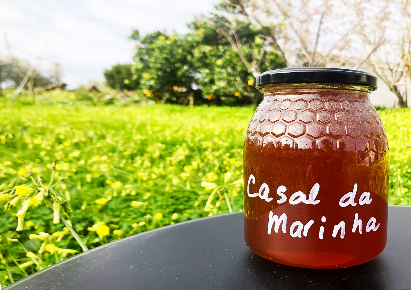 Ze had ook honing, die ze van haar eigen bijen had. Dat is helemaal mooi, dus we wilden ook wel een pot mee. Natuurlijk vraag je dan waar haar bijenkorven staan. Blijkt dat naast Conceição te zijn, dus aan het eind van ons weggetje, hemelsbreed nog geen 400 meter hiervandaan. De bijen hebben zeker een bezoek gebracht aan de bloemen op ons terrein. We kunnen met recht zeggen dat de honing zéér lokaal is.