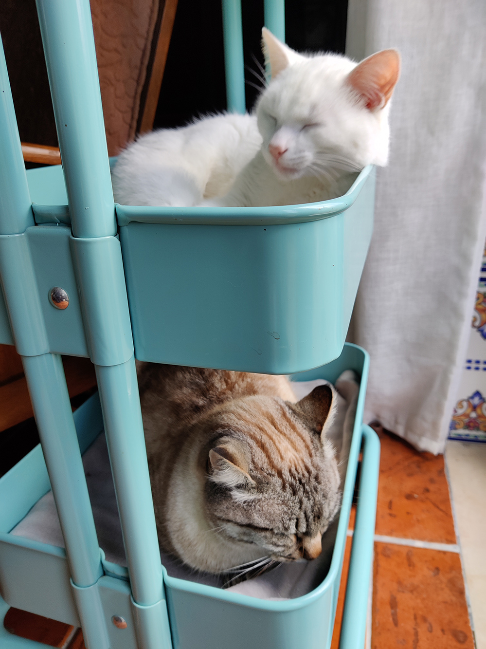 Floki heeft zijn draai wel gevonden. Hij heeft zijn eigen slaapplek, waar hij lekker overzicht heeft over de kamer en als hij zich omdraait over het terrein buiten waar hij lekker de honden kan bekijken. Toen hij net binnen was kreeg hij die plek al toegewezen alleen lag hij toen in een hoekje van het bakje en nu gebruikt hij het bakje wel helemaal. Légolas wil graag bij hem liggen en soms liggen ze dan samen in dat veel te kleine bakje. Als Floki daar geen zin in heeft jaagt hij Légolas gewoon weg door hem irritant te gaan zitten bijten totdat Légolas het opgeeft. We hebben daarom het onderste bakje ook maar als kattenslaapplaats ingericht. Zitten ze toch bij elkaar en toch apart. ’t Is een soort stapelbed geworden.
