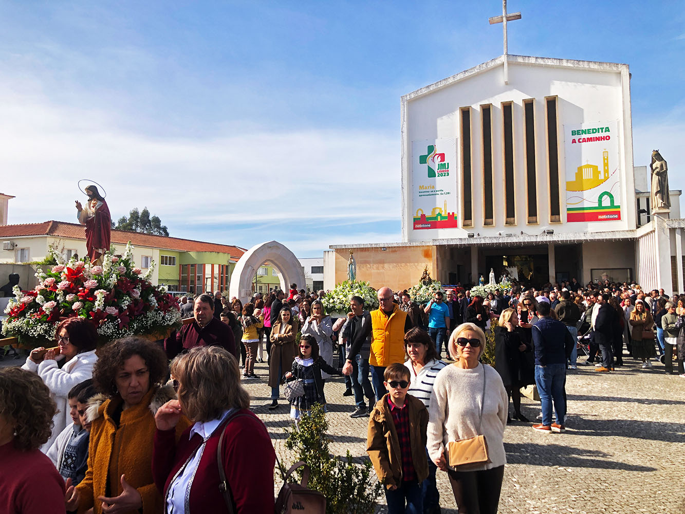 Op zondag is de processie waarbij er mariabeelden en andere beelden door de straten van Benedita worden gedragen. In optocht, acolieten met wijwater voorop, daarachter de priesters, daarachter diverse groepen die een beeld dragen, dan, een beetje potsierlijk, een pickup van de brandweer met daarop waarschijnlijk een heel zwaar beeld. En dan de muziek.
