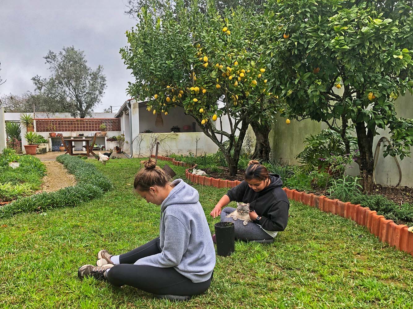 Op het terrein is altijd wat te wieden. In november/december zijn we weggeweest en we moeten eigenlijk nog steeds de achterstand inhalen. Nu het weer wat warmer wordt en het ook nog regelmatig regent schiet het onkruid uit de grond. Vooral de klaverzuring. Met Ella en Lily scheelt het wel, zelfs als het een beetje miezert gaan ze onverdroten door. Lekker muziekje erbij. Een beetje regent deert ze niet. Ze zeggen dat het in Wales altijd regent en dat ze dus wel wat gewend zijn. Voor ons lekker want zelfs als we visite hebben zitten ze buiten gewoon door te gaan. Ondertussen het grasveld min of meer onkruidvrij te maken. Het is eigenlijk onbegonnen werk, maar alles wat eruit is, is meegenomen.