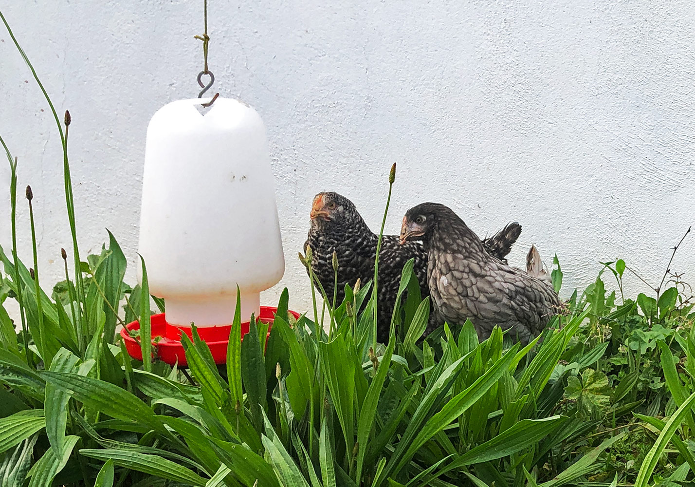 Lily en Ella zijn ook onze nieuwe kippen. We hebben ze vernoemd, omdat ze intensief bij de koop van de kippen betrokken zijn geweest. Ze lopen nu al vrij rond in het hok, en Mortícia en Branca de Neve tolereren ze. Geen probleem. Ze laten af en toe zien wie de baas is, maar dat is het dan wel. Ella en Lily scharrelen rustig rond en pikken letterlijk een graantje mee.