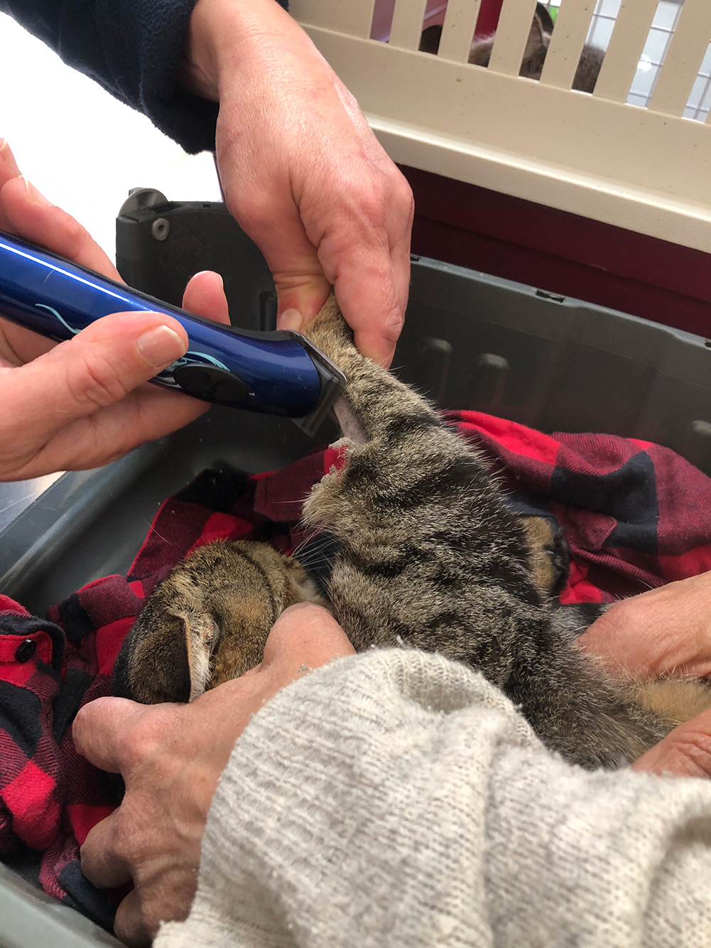 Er is een besmettelijke ziekte, kattenleukemie, die van kat tot kat kan worden overgedragen. Onze katten zijn altijd buiten met andere katten, dus dat risico bestaat. Als de kat eenmaal besmet is, is er niets tegen te doen, maar een vaccin kan het wel voorkomen. Dus: bloedtest, hiervoor moet een stukje vacht weggeschoren worden om een beetje bloed af te kunnen nemen. Even een minuut of tien wachten en je weet het. Het lijkt verdacht veel op de covid-test, alleen dan met bloed en niet met een uitstrijkje van de de neus. De test was gelukkig in alledrie de gevallen negatief, dus een vaccinatie, prik in het nekvel. Gaat erg makkelijk, zonder morren van de katten, ze laten het gelaten allemaal toe. Dan ook nog even pillen tegen parasieten in de ingewanden en nog een pipetje tegen teken. Kunnen ze er weer even tegen.
