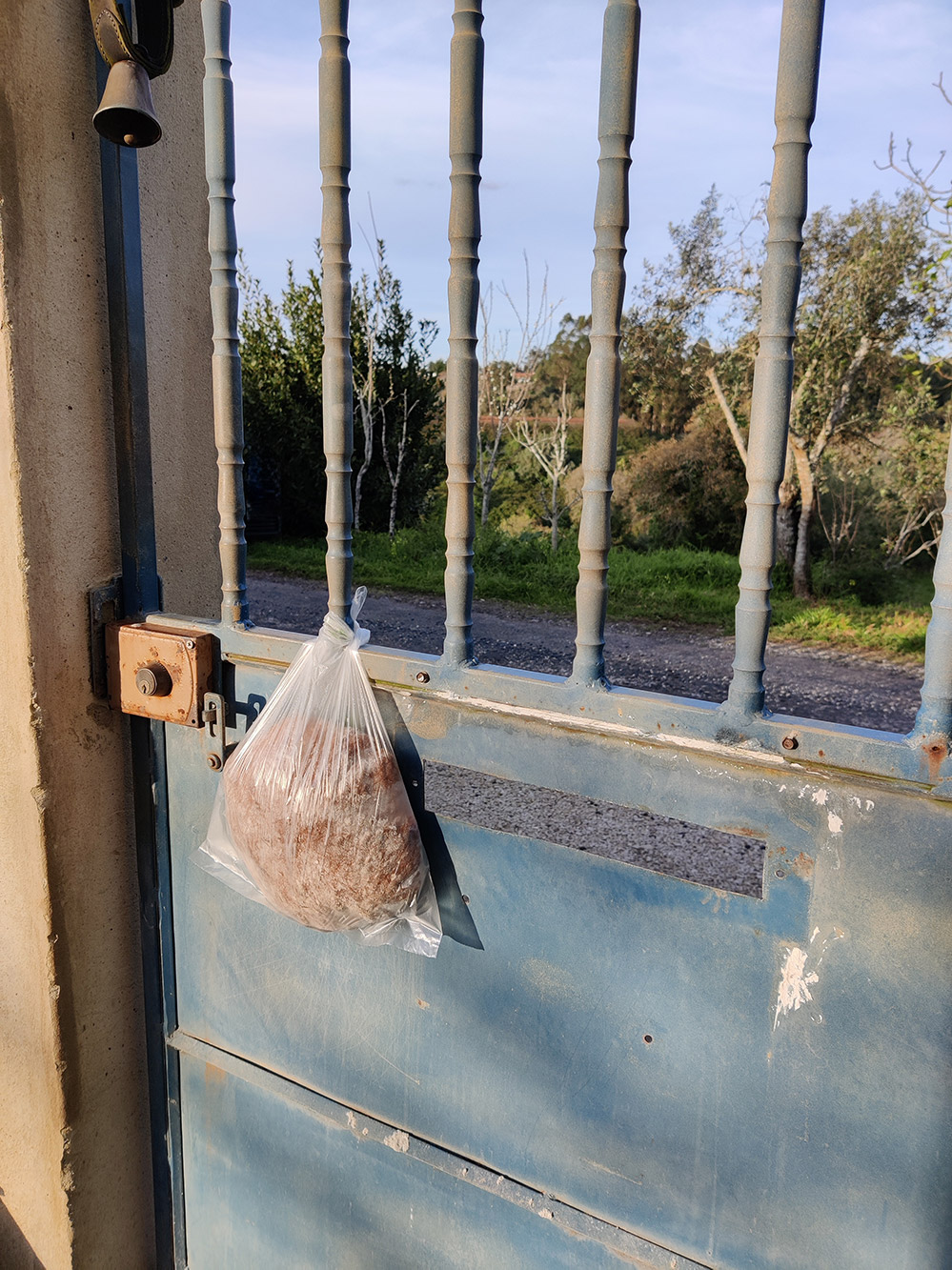 Ze is al een paar keer geweest en nu, als we er niet zijn, hangt ze het brood aan het hek.
