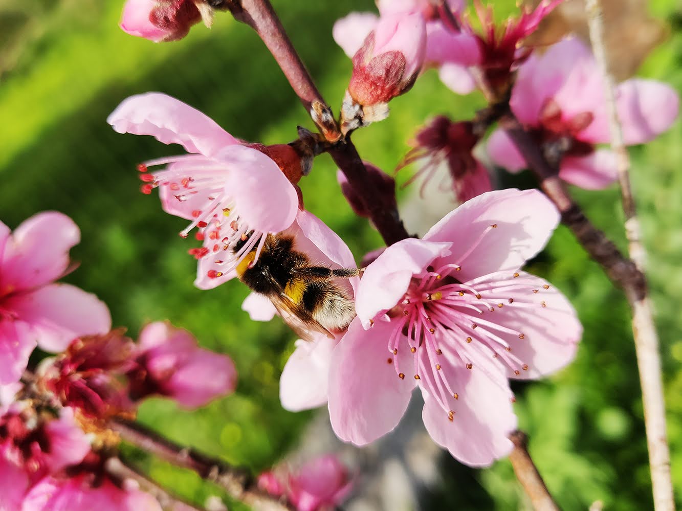 ’t Is nog maar net half maart, maar er begint al van alles te bloeien. De wilde perzik staat er in vol ornaat bij. De hommels en bijen zijn er ook allemaal, het is daarom een drukke boel bij de boom.