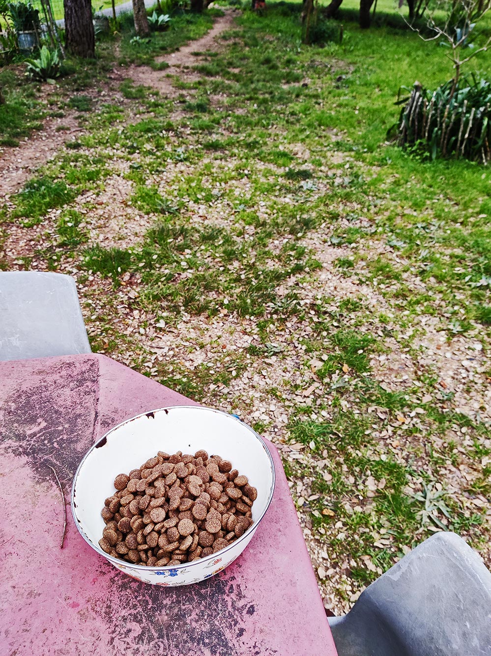Elke ochtend als we met de honden gaan wandelen, nemen we alvast een bak voer mee. Dat zetten we dan op de kolommen van het hek en als we gelopen hebben gaat he mee het terrein op waar we de honden eten geven. Meestal zit er nog wat in die bak en die nemen we dan weer mee terug.