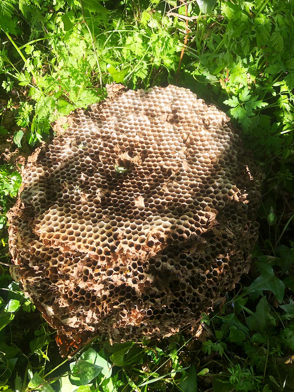 Het nest van de Aziatische hoornaar is nu in zijn geheel naar beneden gekomen. ’t Was al een tijdje verlaten sinds de populatie uitgeroeid is, er wordt geen onderhoud meer aan gepleegd en de wind, de zon en de regen hebben vrij spel gehad. Het nest ligt nu aan de voet van de boom waar het ingehangen heeft. Het is een prachtig bouwwerk van mooie zeshoekige gaten. Ondanks dat het een meter groot is weegt het helemaal niks. De muurtjes tussen de raten zijn flinterdun. Het is eigenlijk een meesterwerk en jammer dat het nu aan het vergaan is.