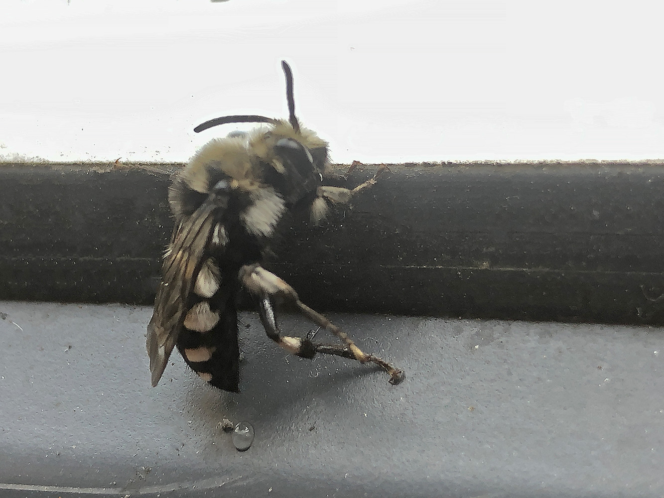 Deze zat zomaar ineens bij het raam. Het diertje is niet ziek of zo, hoor. Het zit er een beetje zielig bij, maar nadat we het raam open hebben gedaan vloog het gewoon weg. Even opzoeken natuurlijk. Het blijkt de Witte Rouwbij te zijn. Het is een solitair levende bij die parasiteert op andere bijensoorten. Ze leggen hun eieren brutaalweg bij andere bijen in het nest, lekker asociaal zou je zeggen.