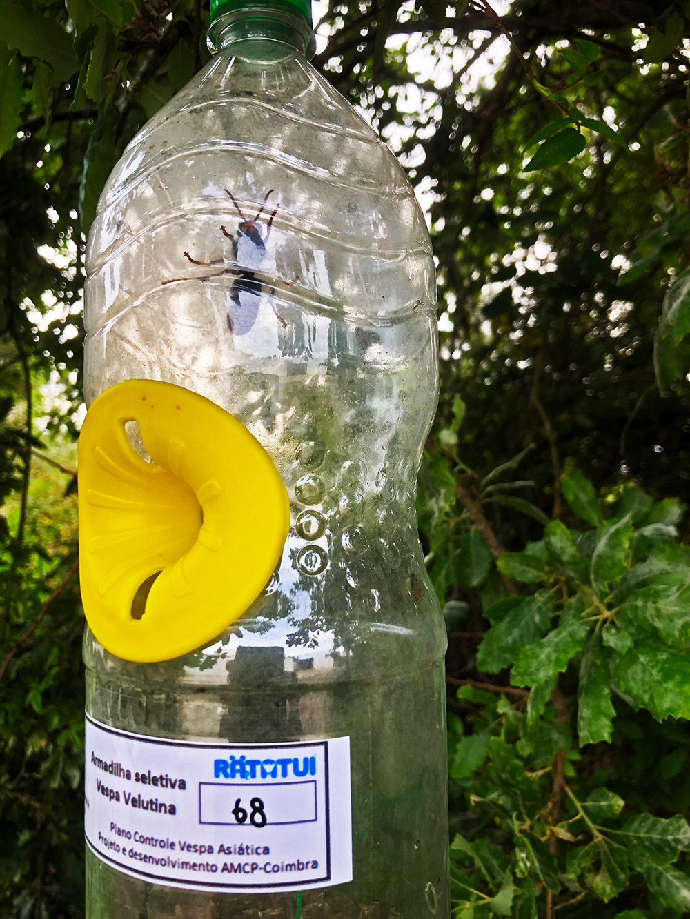 De gemeente Caldas da Rainha, waar wij ook onder vallen, is het wespenprobleem serieus gaan nemen, zo lijkt het. Langs het weggetje, op een stuk dat door niemand beheerd of schoongehouden wordt, hangt zomaar ineens een wespenval. Op het etiket staat dat het een selectieve val is voor de Aziatische wesp. ’t Werkt ook nog want in de fles zit een exemplaar. Als je goed kijkt zie je dat er kleine gaatjes in de fles zitten. Het is de bedoeling dat andere insecten dan de Aziatische wesp kan ontsnappen, maar de Aziatische wesp zelf niet. Simpelweg doordat die groter is.