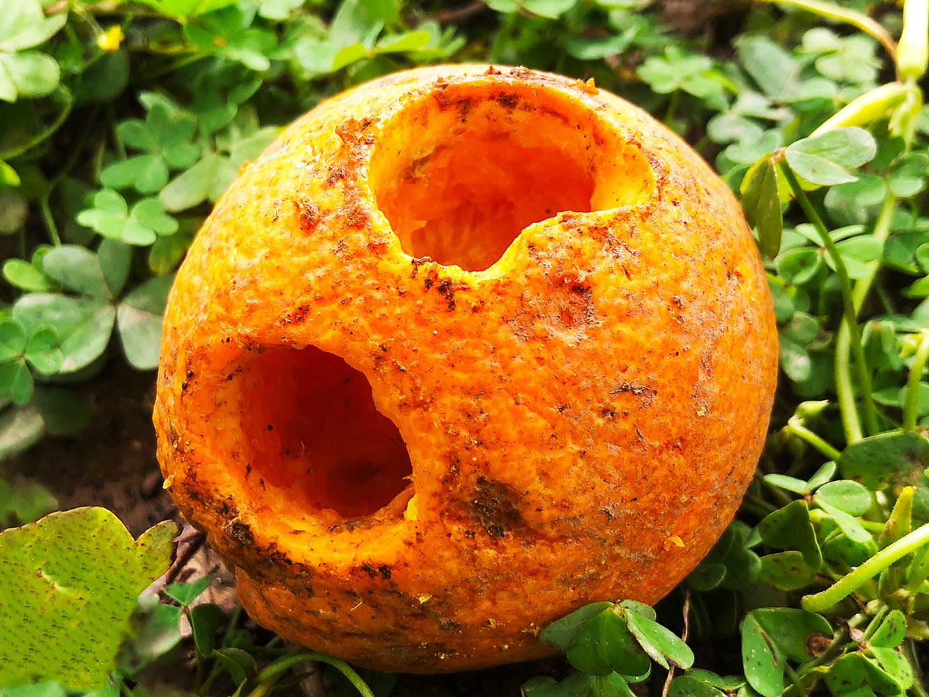 Nee, het zijn niet de Aziatische wespen die gaten in de sinaasappelen eten. Je zou het bijna zeggen met die prachtige ronde uithollingen. Het zijn Lily en Ella, onze jonge kippen. Als een sinaasappel van de boom valt en er een klein gaatje in gemaakt wordt door de mieren of andere kruipertjes, laten we ze liggen onder de boom. Ze vergaan dan langzaam en brengt stoffen in de grond die de boom weer nodig heeft om nieuwe sinaasappels te maken. Soort van natuurlijke kringloop.