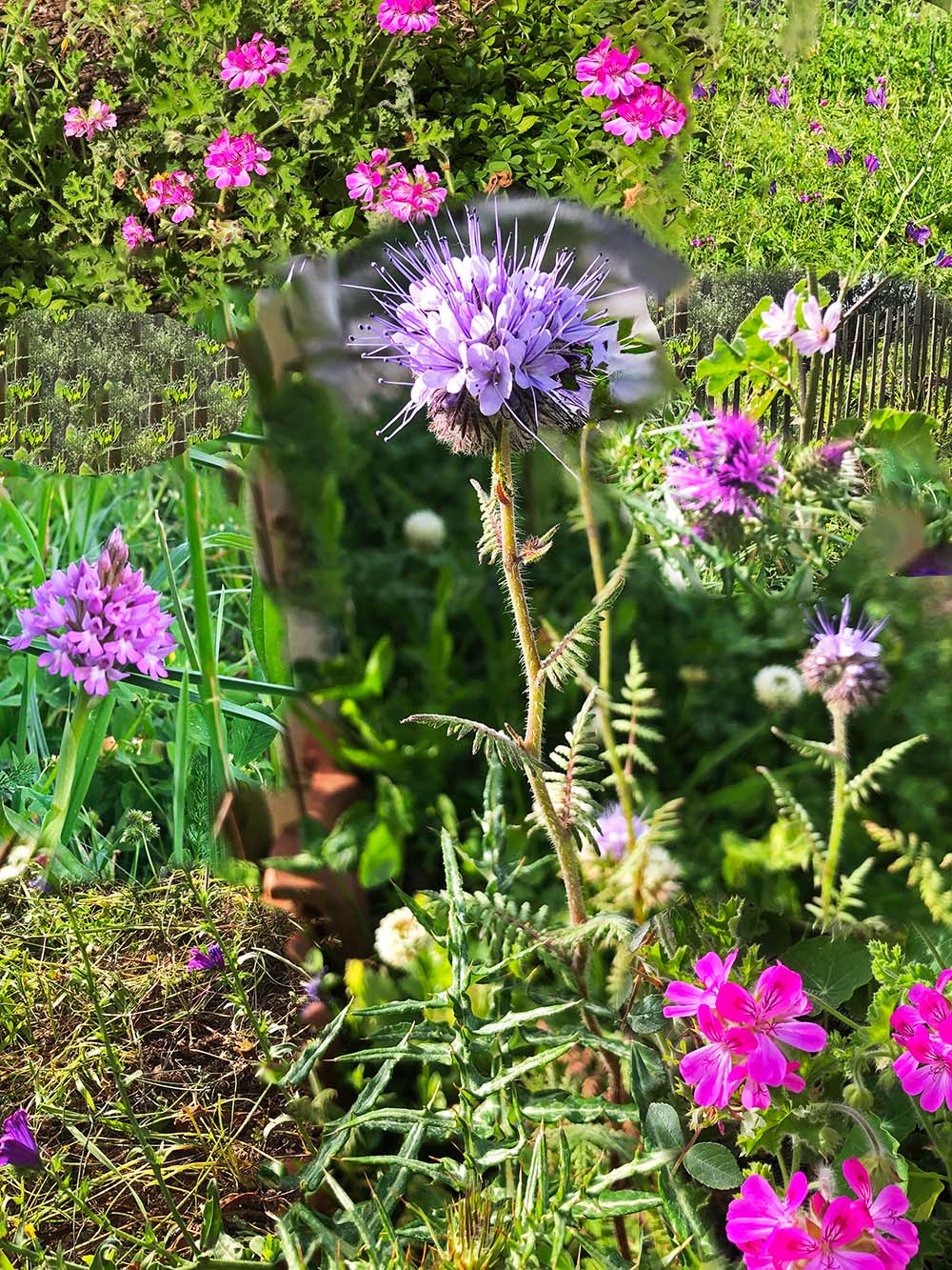 Het lijkt wel of de natuur in de paarse periode zit. Nu de zon weer lekker schijnt staat er van alles te bloeien, paars is dan wel de overheersende kleur. Natuurlijk zie je wel gele klaverzuring en witte klaver en zelfs af en toe gele ganzenbloem. Maar verder is het paarse distels, paarse siererwt, paarse geraniums, paars hondskruid, paars bijenbrood, paars kaasjeskruid.