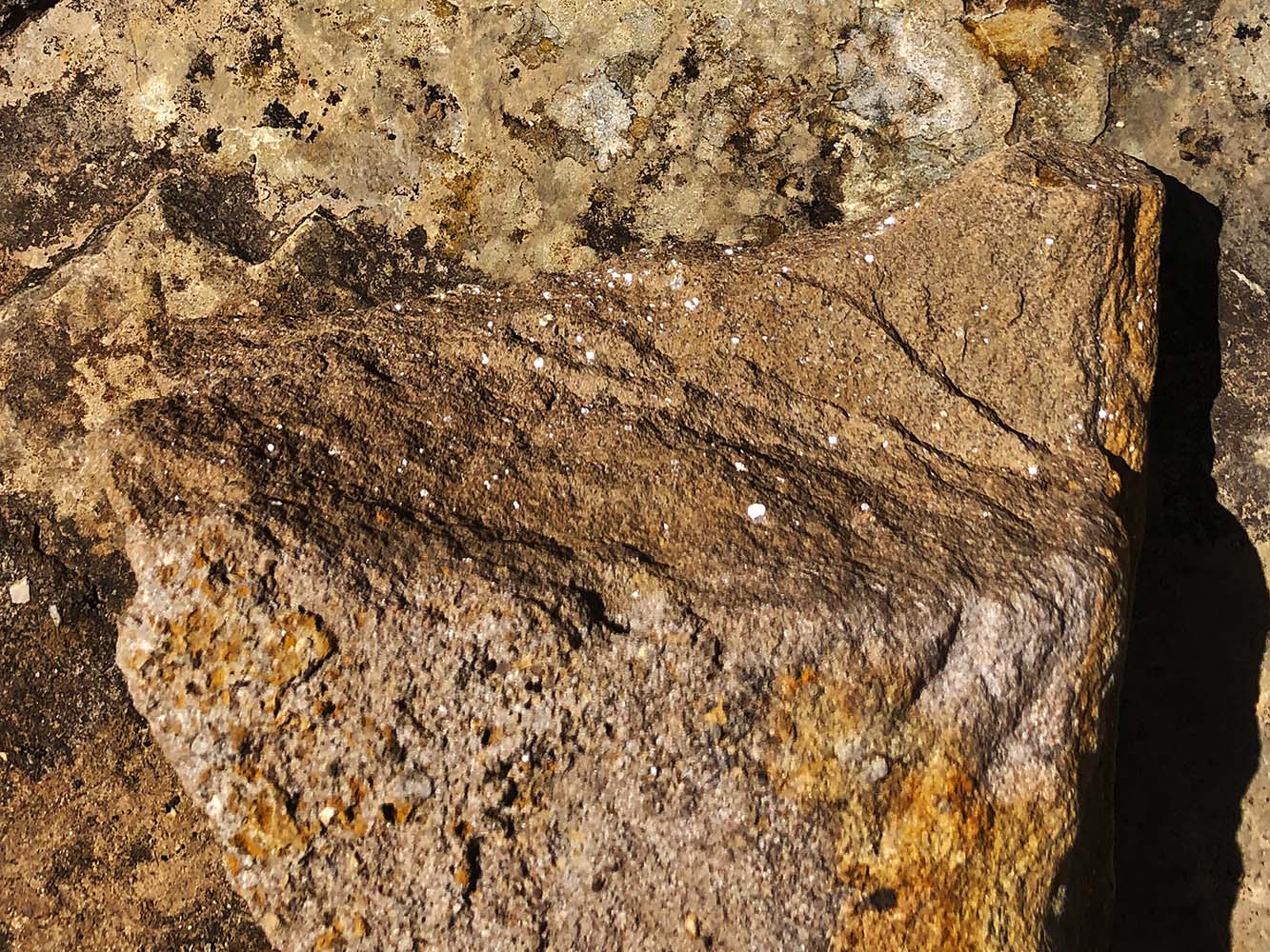 Niet alle stenen hebben dat, ze komen nu natuurlijk van allemaal van het terrein van Gil, maar goede kans dat ze door eerdere bewoners van Portugal overal vandaan gehaald zijn en daarom niet allemaal dezelfde samenstelling hebben. Door het schoonmaken komen er ook allemaal verschillende kleuren tevoorschijn. Een beetje bordeaux-rood, een beetje groenig soms. Nergens felle kleuren maar wel leuke nuances.