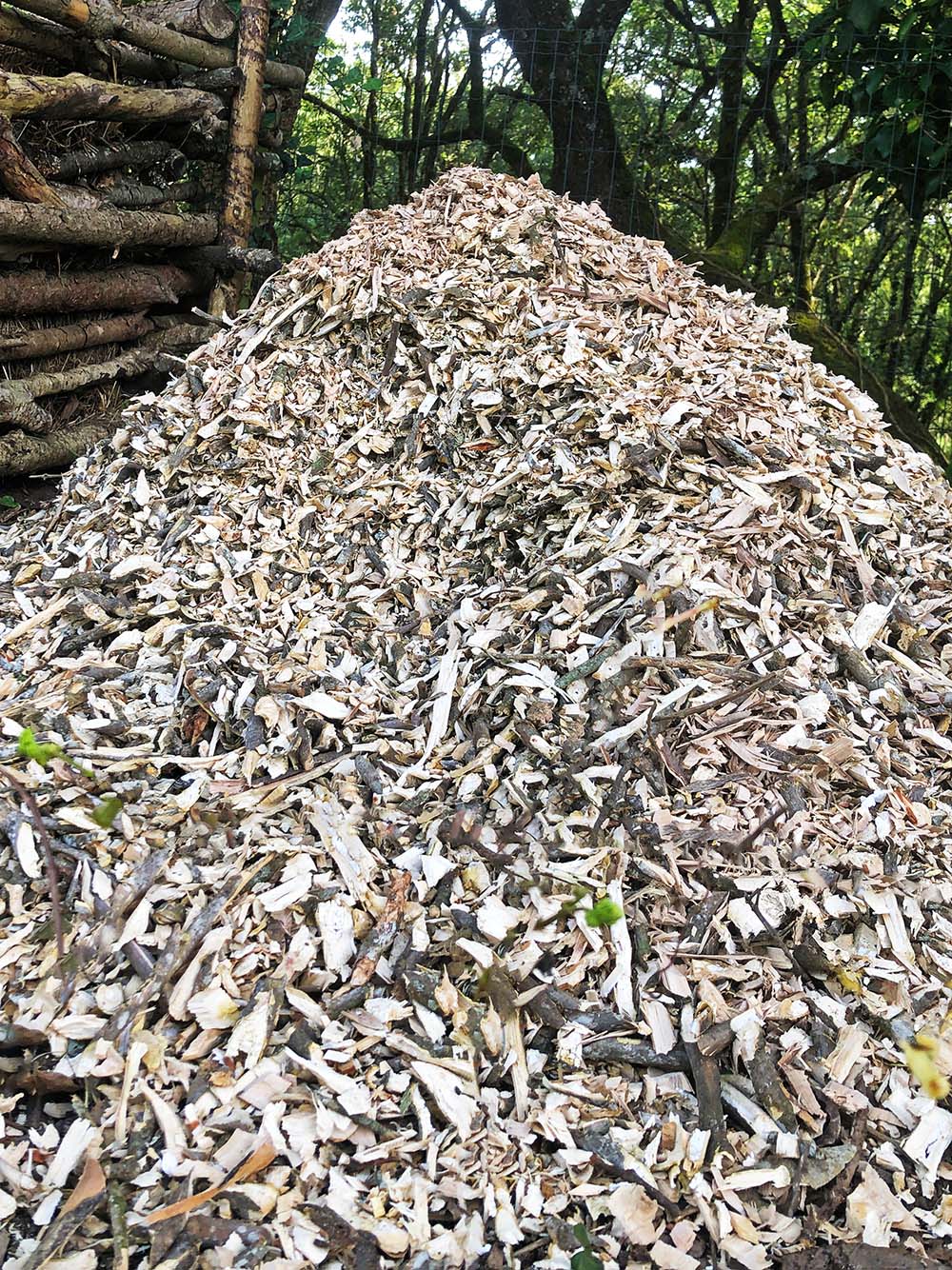 En ja! Hij wil starten, de messen draaien, we kunnen aan de slag. Een paar uur later is de takkenberg weg, hebben we drie kuipen vol met snippers.
